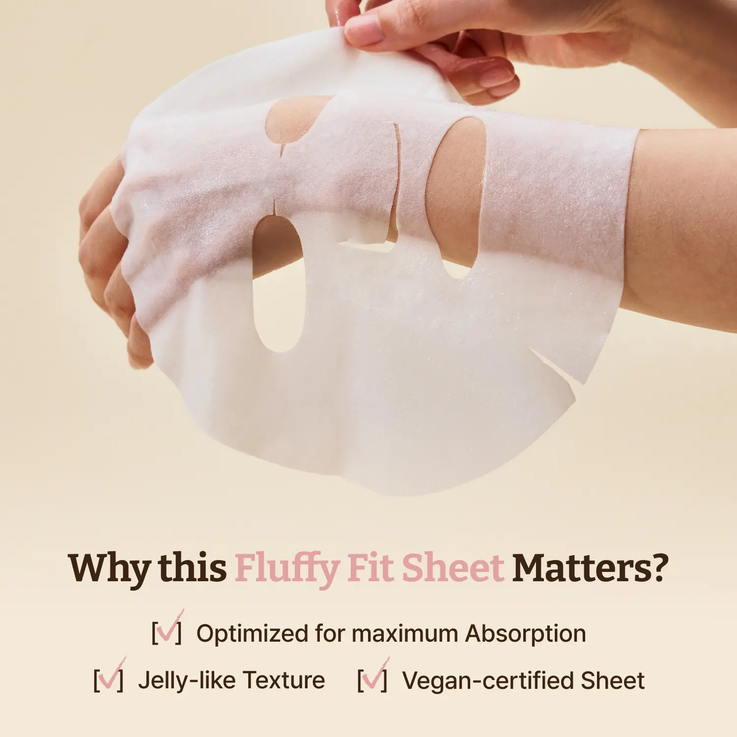 ·FLUFFY-FIT SHEET WITH JELLY-LIKE TEXTURE— The soft, breathable sheet adheres seamlessly to skin and is optimized for enhanced PDRN absorption, while the rich jelly texture helps lock in moisture without heaviness.