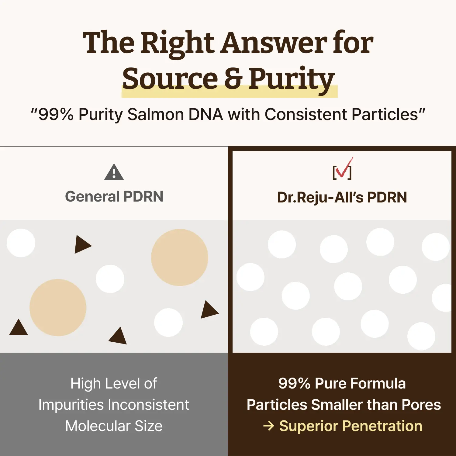 ·ADVANCED PDRN WITH 99% PURE SALMON DNA — Refined through advanced purification methods for high purity. The uniform micro-sized particles are designed for smooth application, reflecting innovation in Korean skincare formulation.