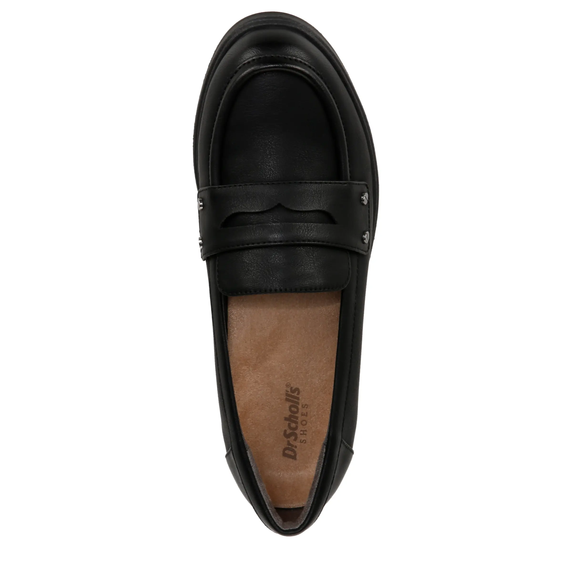 ·STYLE: Womens flat loafers with penny keeper strap, metal stud detailing, and 1 inch stacked block heel