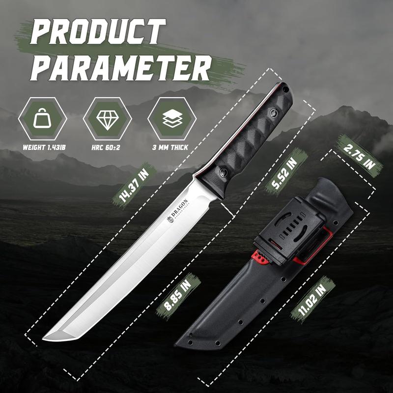 The textured composite handle is firmly anchored through a full-tang construction with reinforced fasteners. A hanging hole at the base allows convenient storage and carrying during outdoor excursions.