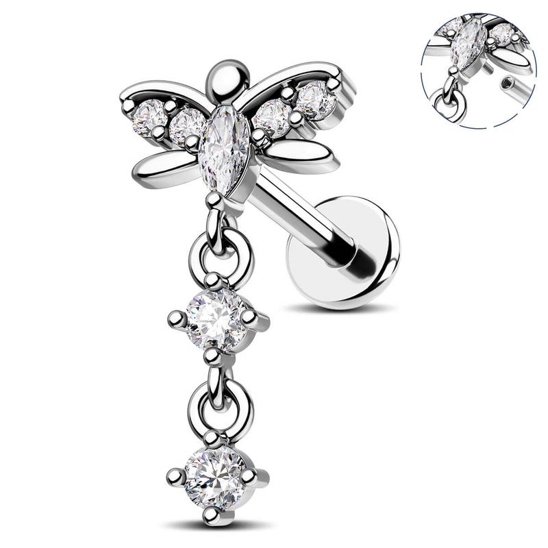This 16G dragonfly Helix stud is a remarkable piece that seamlessly merges nature's grace with dazzling glamour.