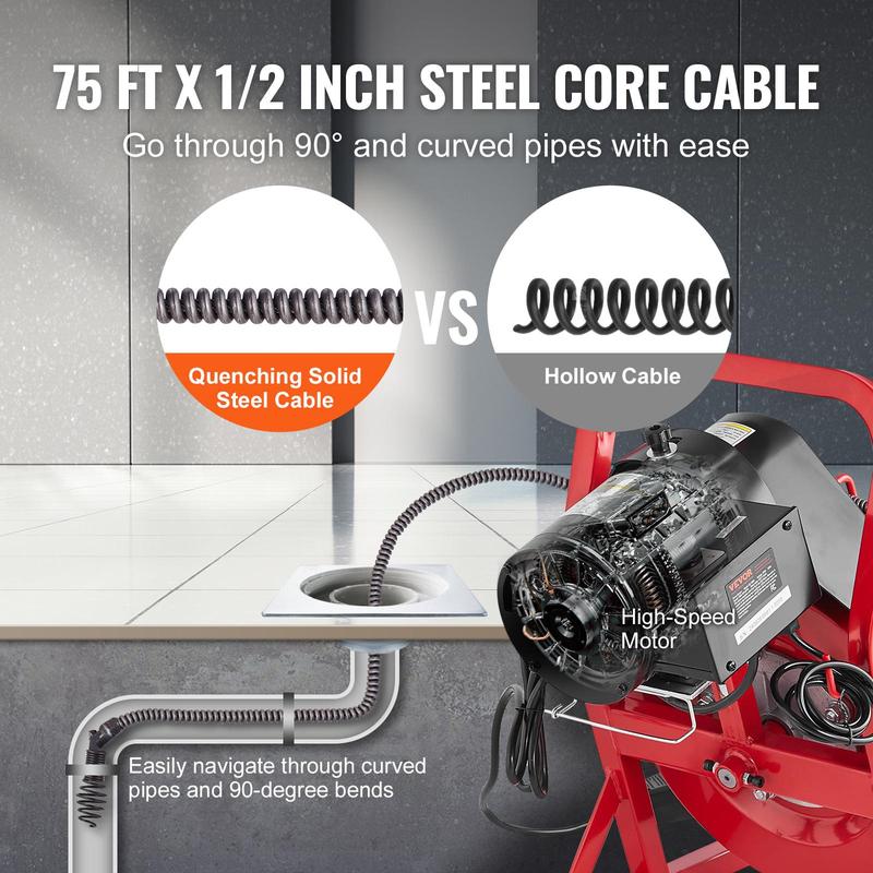 • Premium Steel Core Cable: Our 75 FT x 1/2" steel core cable is designed to resist breakage, twisting, and corrosion, ensuring easy navigation through complex curved pipes. Ideal for 2 to 4-inch pipes, it ensures a smooth and efficient cleaning process