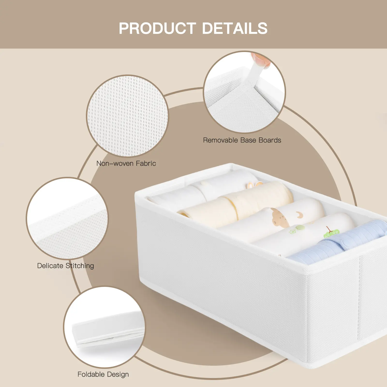 ·Durable Design:Crafted from sturdy non-woven fabric, these dresser drawer organizers feature high-quality stitching for enhanced durability. Reinforced with heavy plastic boards on the sides and bottom, these bins maintain their shape over time. They are also odorless, making them ideal for storing baby clothes