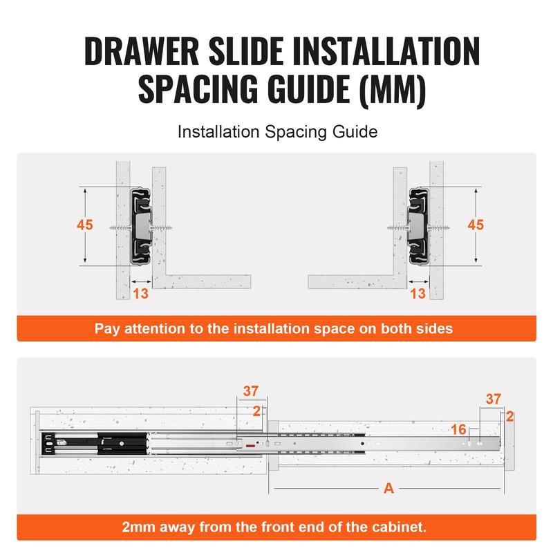 • Installation Guidance: Our side-mount drawer slides are designed to address installation pain points. Specially designed installation spacing guidance places the slides 2mm from the front end of the cabinet, making the installation process easier and avoiding unnecessary hassles.