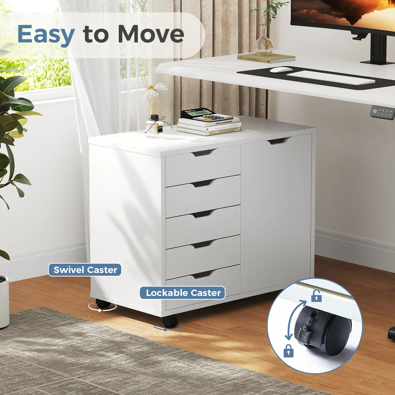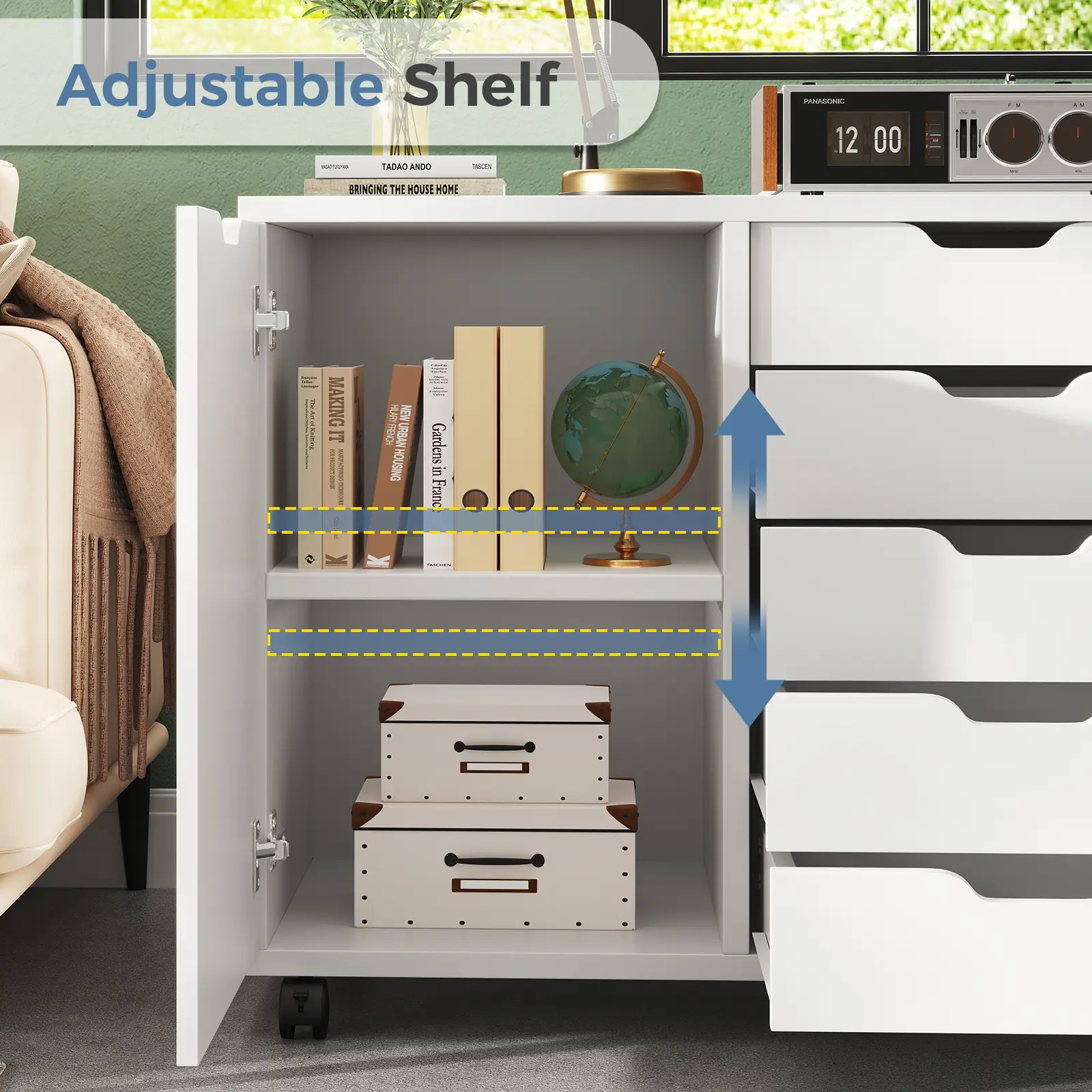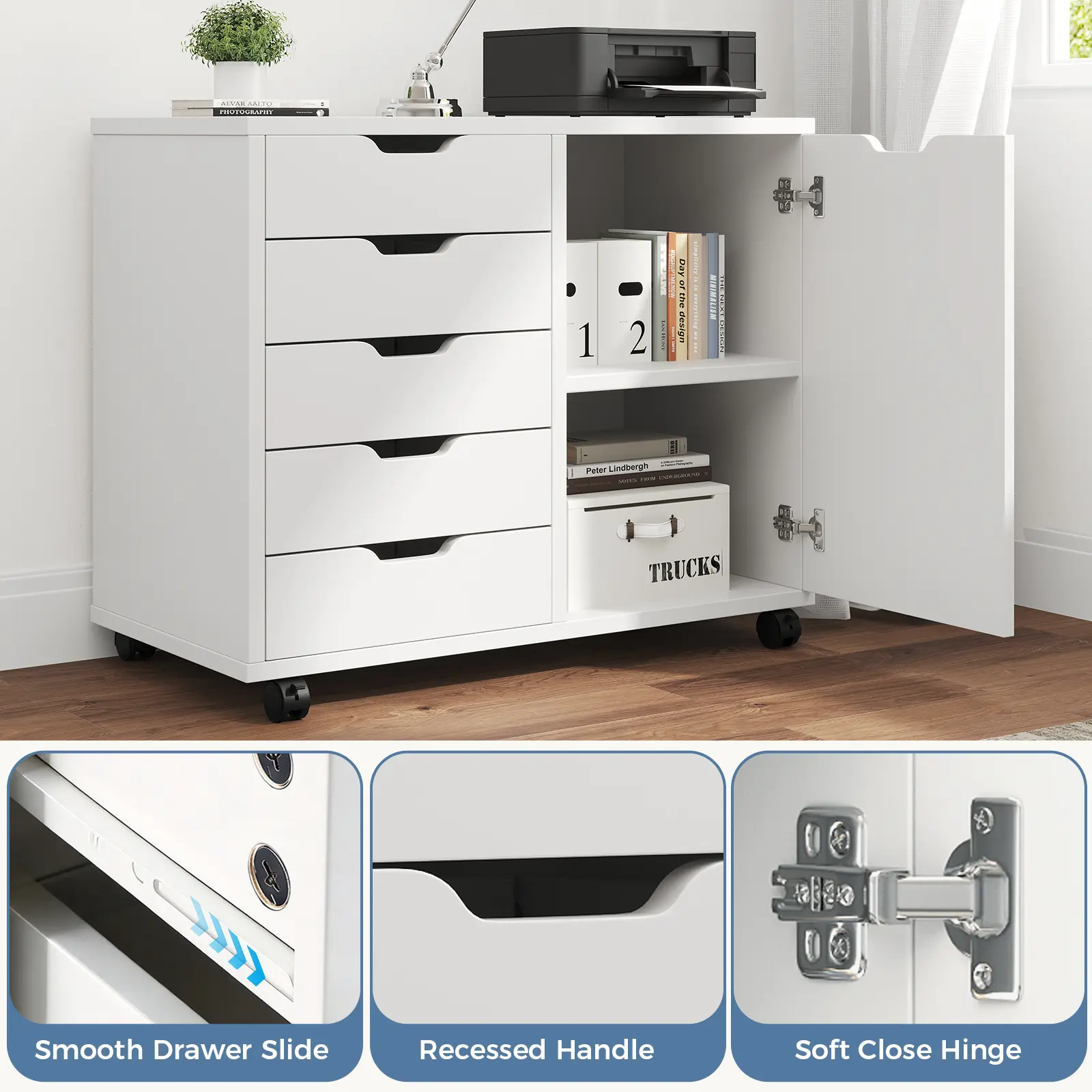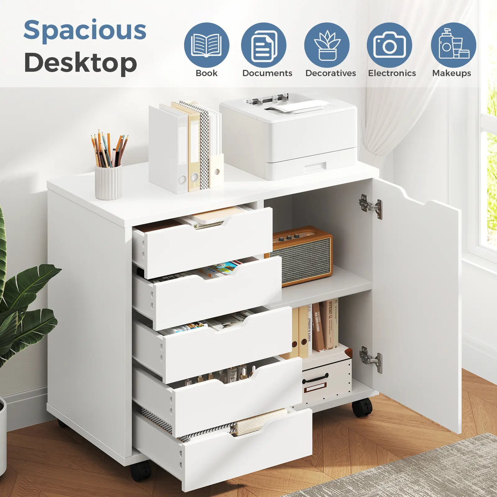 The 5-drawer cabinet provides practical storage solutions for home offices, study rooms, or living rooms. It features a spacious desktop for printers or scanners, and doors with storage shelves. This design enables organized space division. The cabinet is perfect for maintaining a tidy and functional workspace.