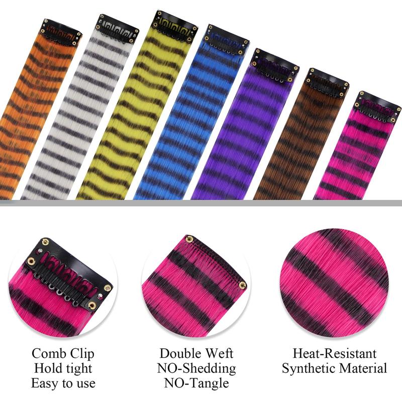 Ā·6-piece, 30g per strip ā 20-inch synthetic feather striped hair extensions. Made from durable, high-temperature synthetic fibers.