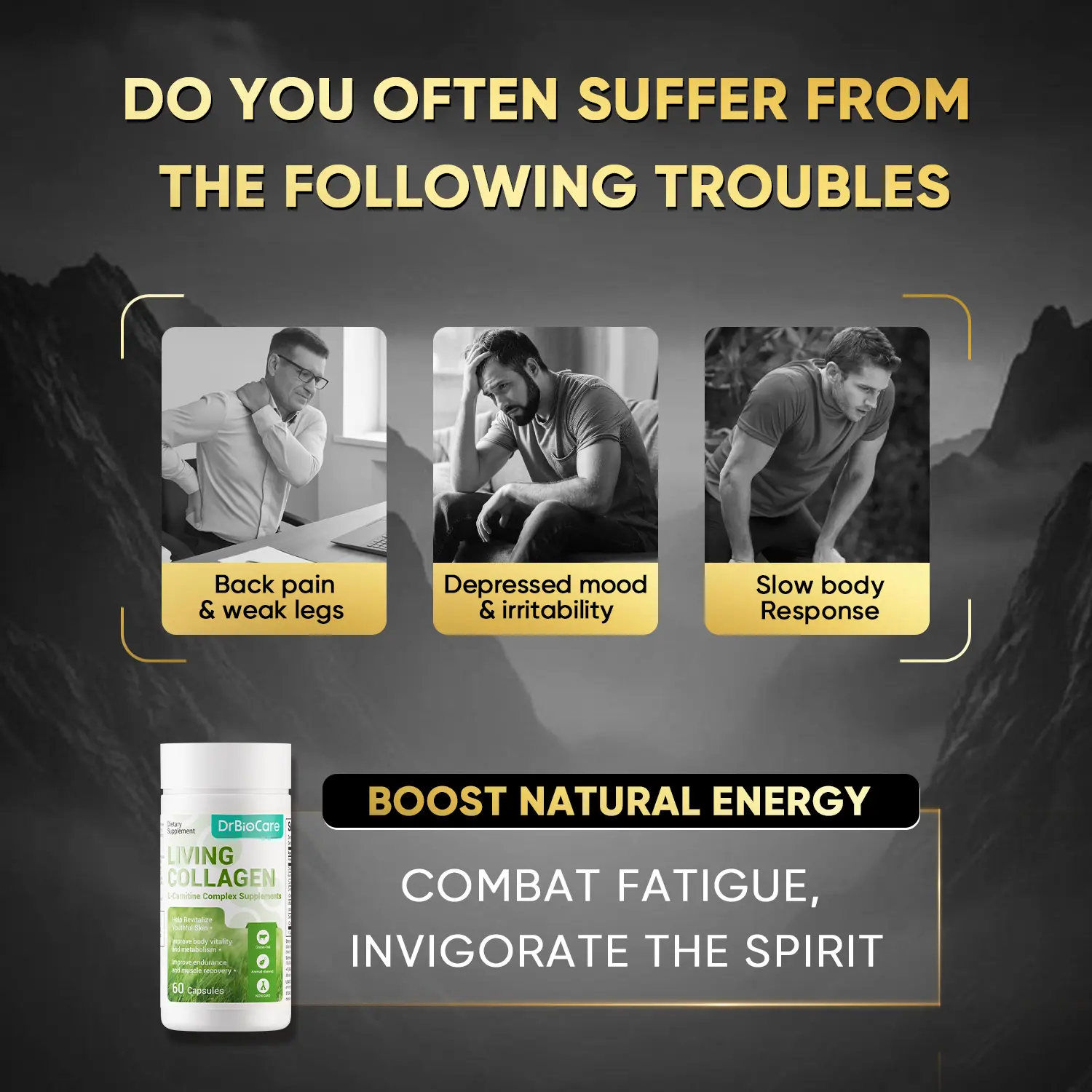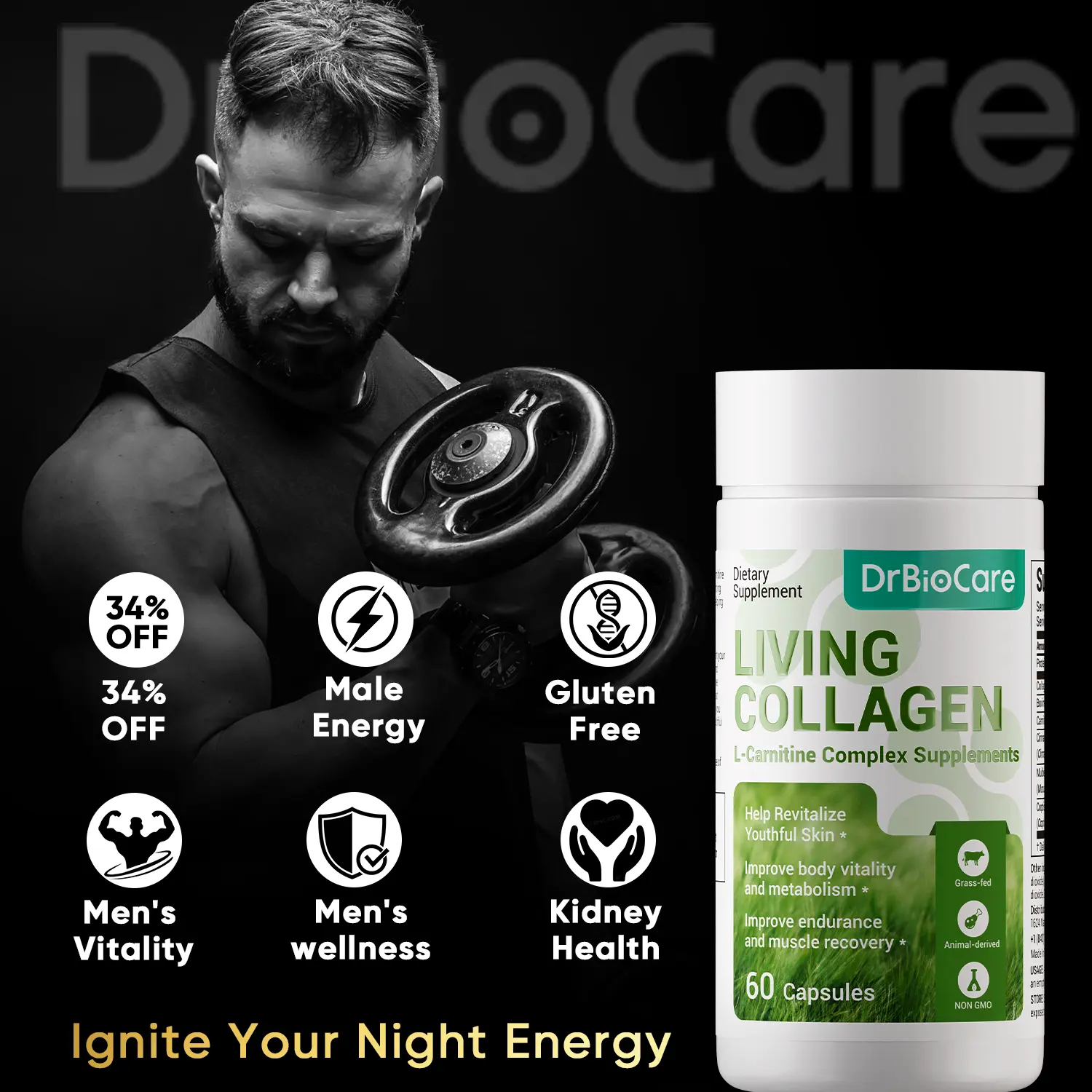 DrBioCare Men’s Supplement — Boosts Strength&All Day Energy — Featuring L-Carnitine + Living Collagen — 60 Capsules