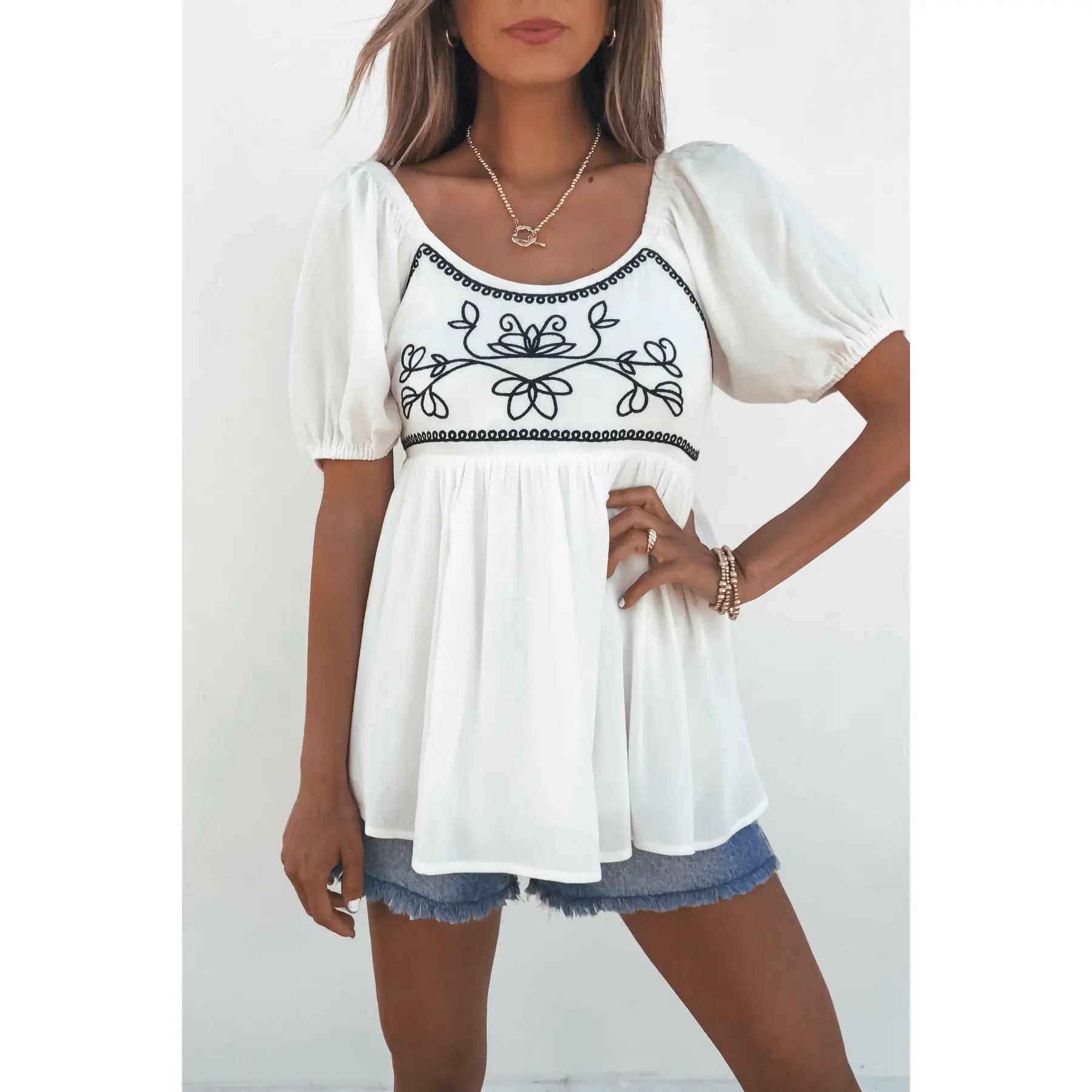 Crafted from soft, breathable material, this smocked back babydoll top offers a relaxed fit, perfect for everyday wear or dressing up. The short puff sleeves and elastic neckline provide a charming, feminine silhouette, while the delicate embroidered details elevate this piece to a timeless favorite. Pair with your favorite denim jeans or a flowy skirt for a chic boho vibe. Ideal for brunch with friends, a stroll in the park, or a casual date night.