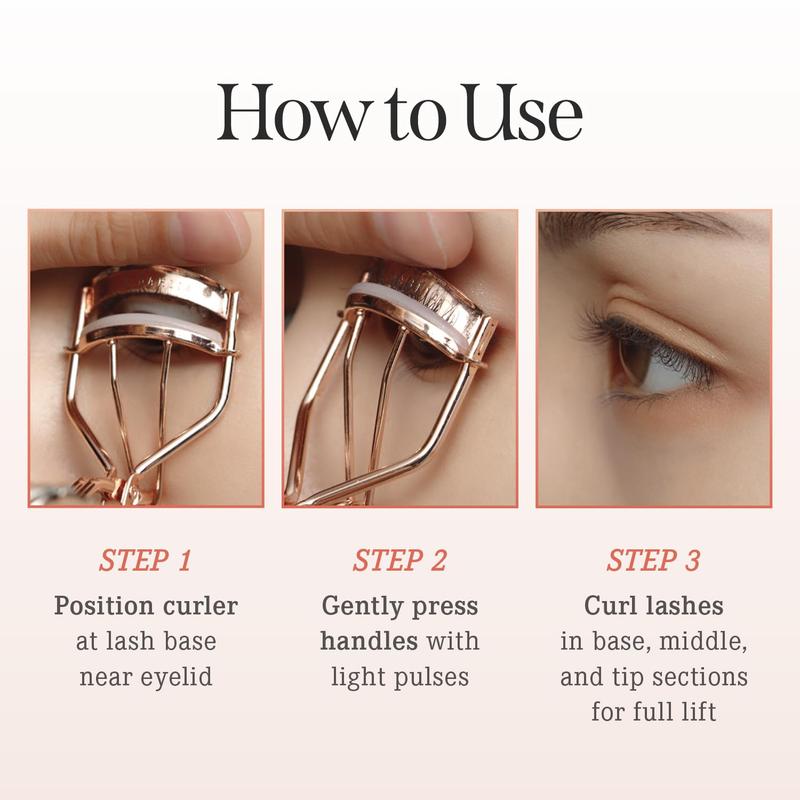 ·Line up the open curler along the base of your upper lashes, resting lashes on the silicone pad.