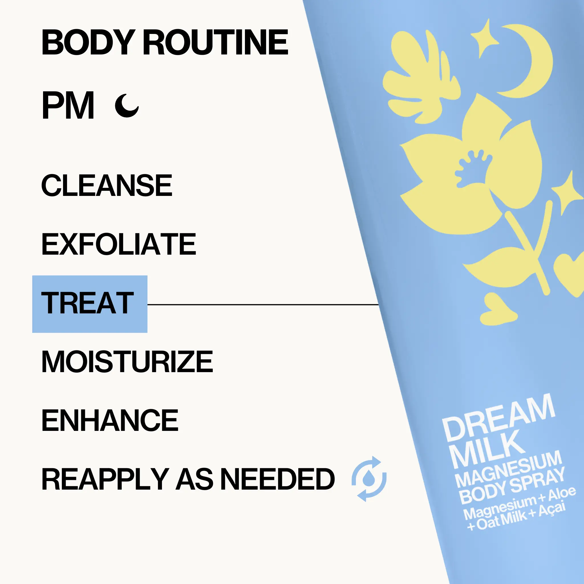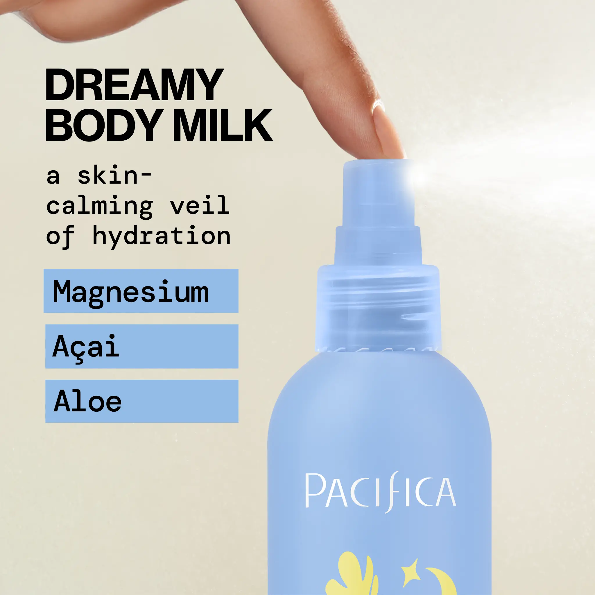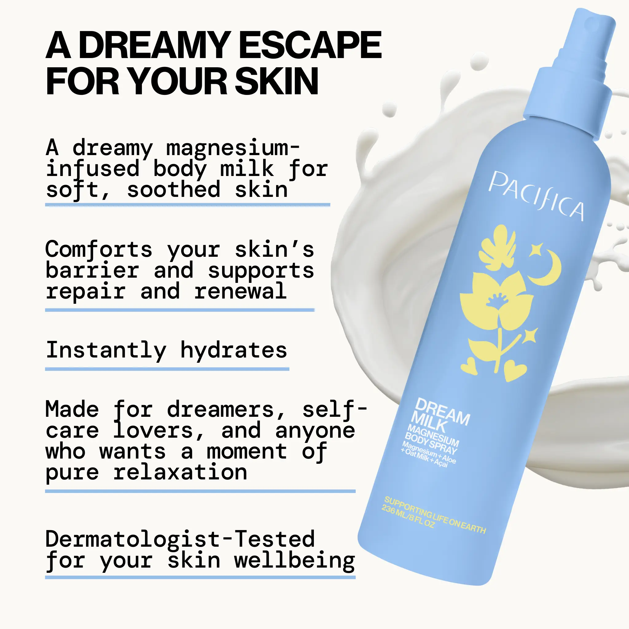 Dream Milk Magnesium Body Spray delivers essential hydration and supports relaxation + skin nourishment with a magnesium-infused blend. Easy spray-on absorbs quickly and preps your body for a great + restful bedtime experience. Dermatologist-tested for your skin's well-being.