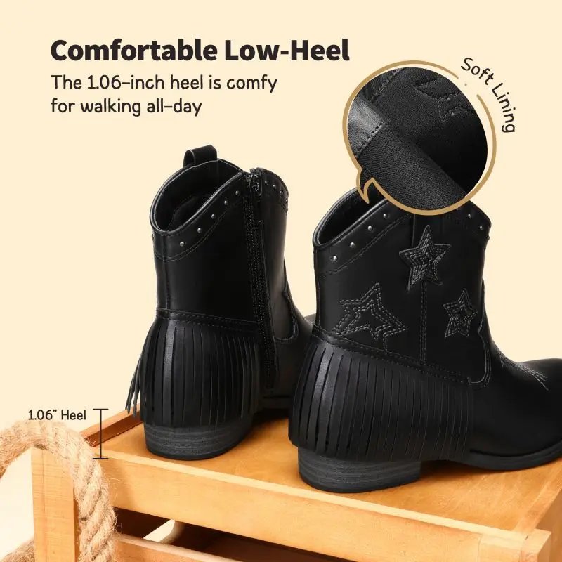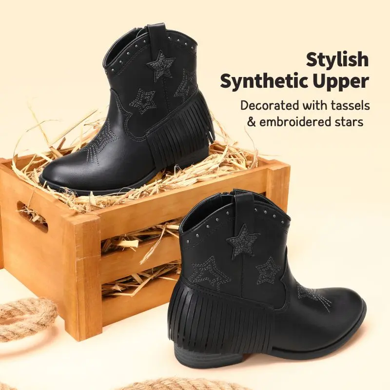 Stylish Design: Give your child a taste of cowboy style by adding these stylish girls' Western boots to their wardrobe. Featuring a soft faux leather upper, star embroidery decoration, and tassel detail around the heel, these girlsā cowboy boots are both comfortable and fashionable.