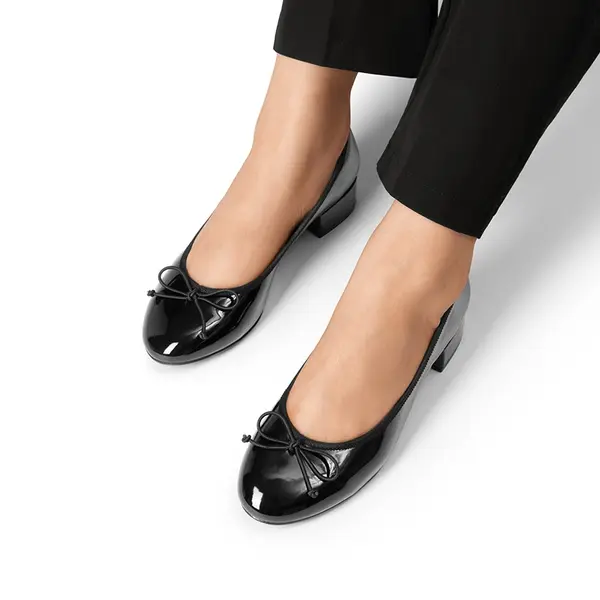 Crafted with a vegan patent leather upper, these ballet pumps exude sophistication while embracing fashion. The synthetic lining ensures a soft and smooth feel against your skin, guaranteeing long-lasting comfort. With a cushioned insole, these ballet pumps provide the perfect balance of support for busy days. Elevate your look with the block heel, offering just the right height, stability, and comfort in every step.