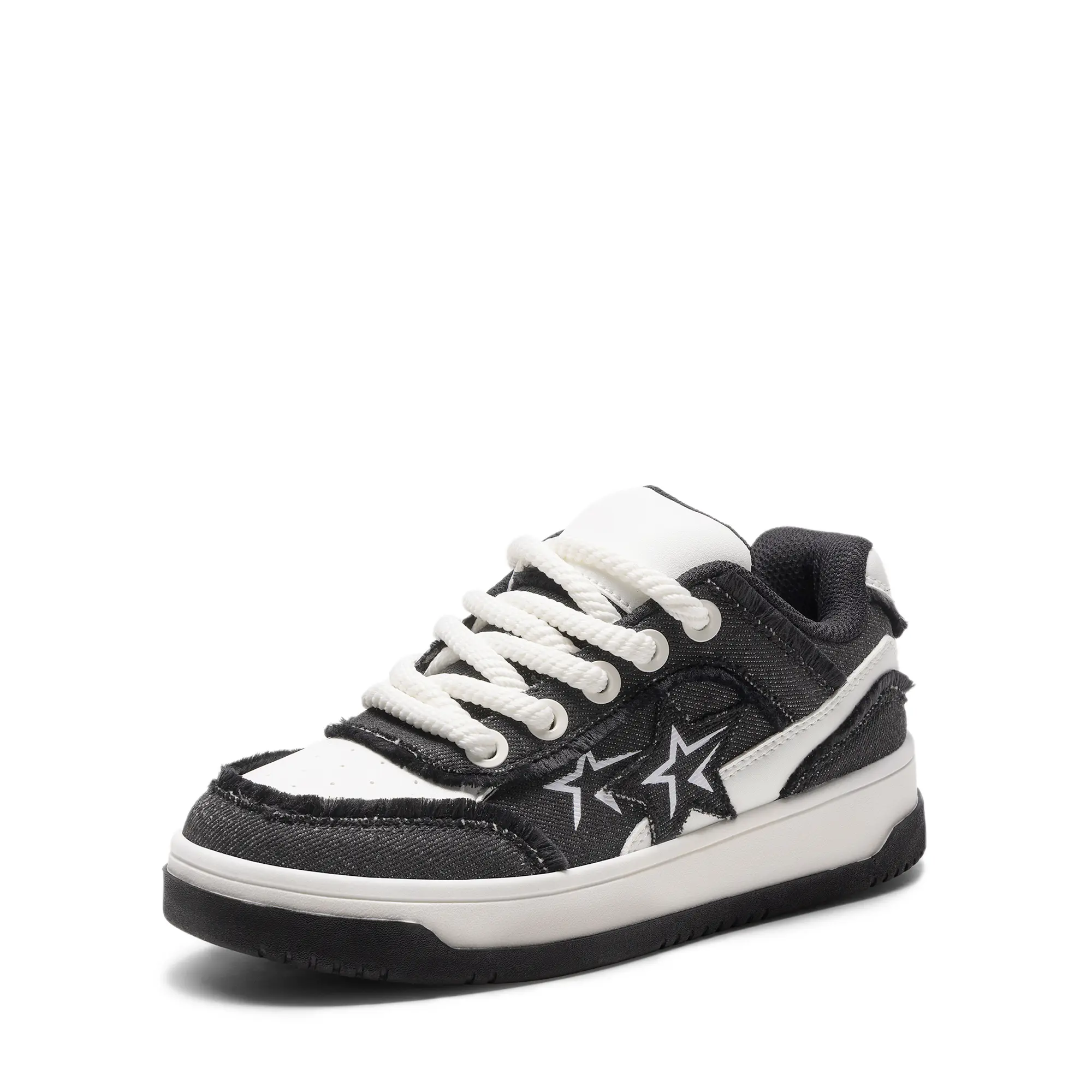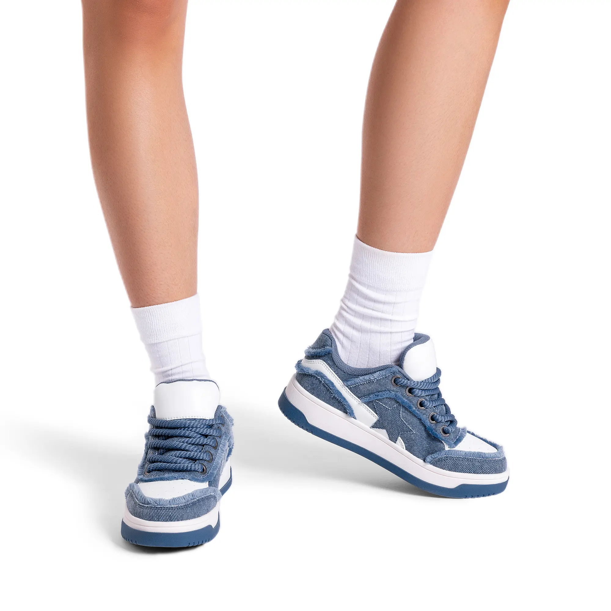 ·Trendy Design: These women’s fashion sneakers feature a stylish mix of layered denim, textured vegan leather, and frayed detailing, creating a unique and fashionable casual look.