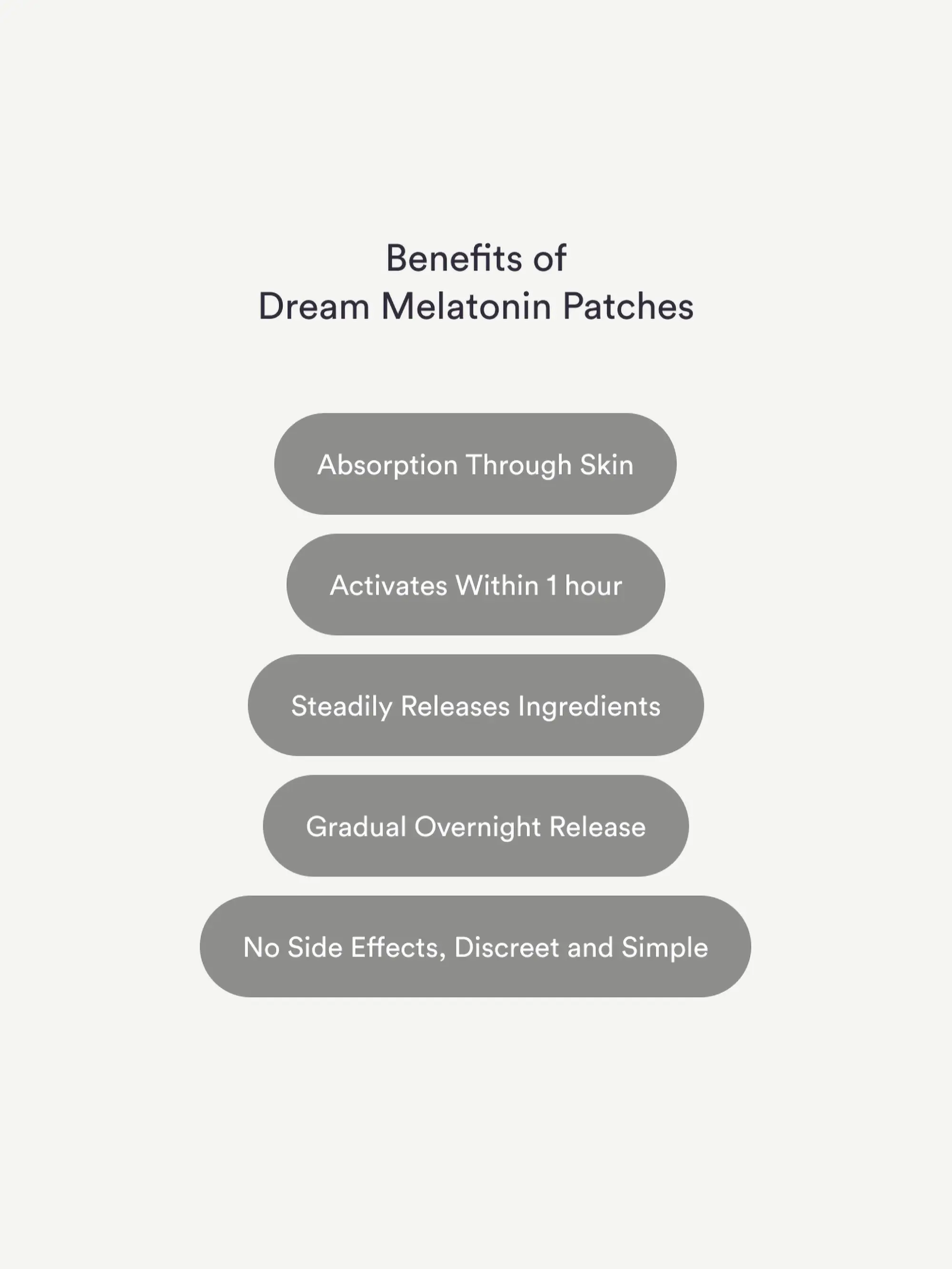 ·Melatonin: A naturally occurring hormone that regulates the sleep-wake cycle. Our patches deliver a steady dose to help you fall asleep faster and improve sleep quality.