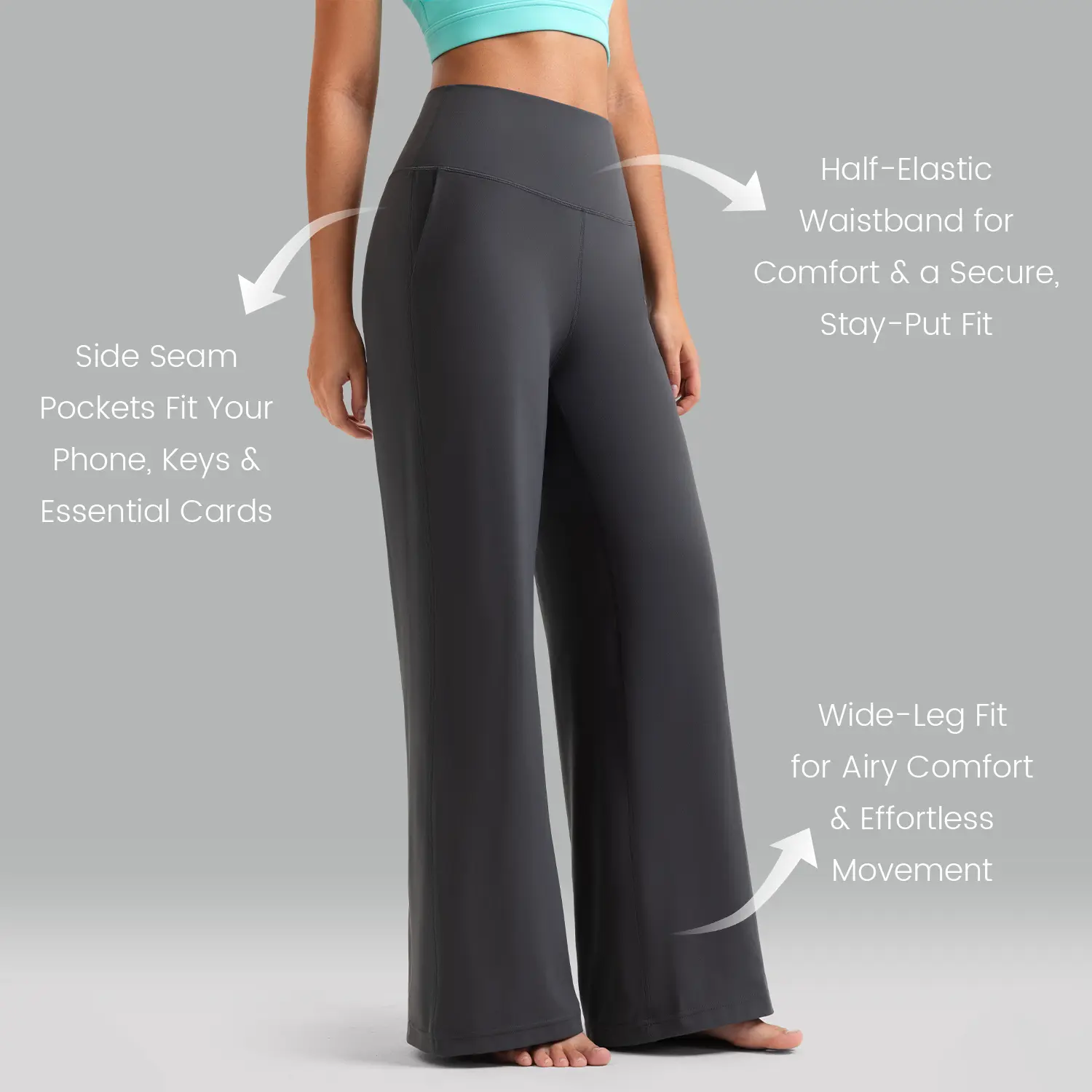 ·Design: High waist and wide leg cut.