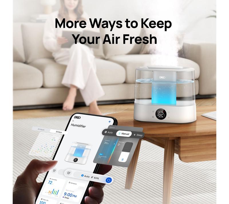 Breathe in a refreshing atmosphere at home as this ultrasonic humidifier delivers ultra-fine cool mist across every corner of your room. Its spacious 4-liter tank, app and voice control, and whisper-quiet operation are made for hassle-free comfort and restful nights, while built-in aromatherapy brings a gentle spa-like touch to your daily routine. From DREO.