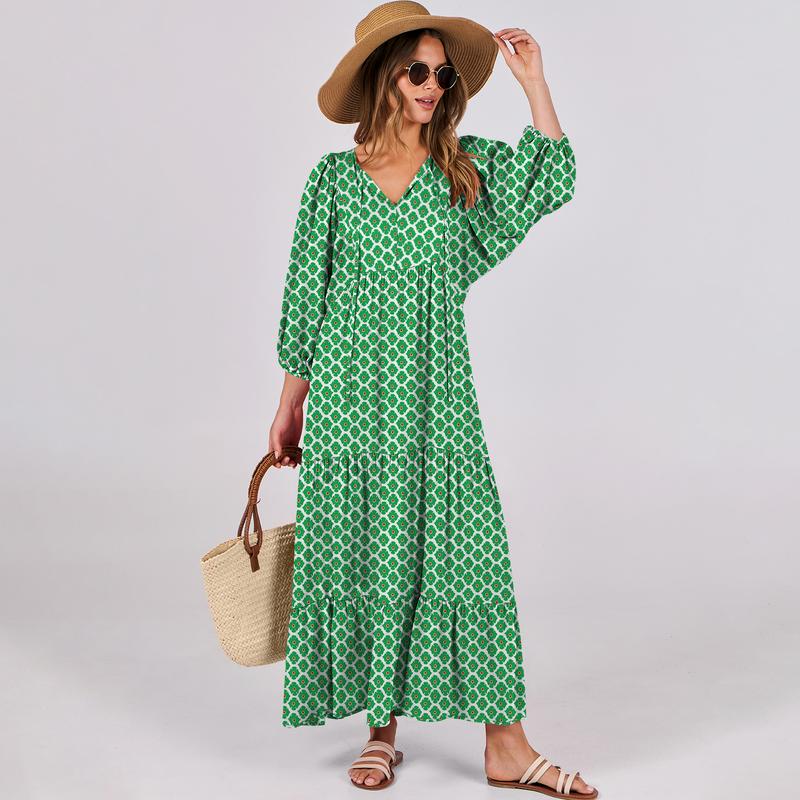 ·Features: Maxi Dresses,Bohemian floral printed, lantern puff sleeve, flowy ruffle, a line, drawstring v neck, empire Waist,tiered swing dress, casual elegant, relaxed Fit