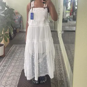 ·Features: Casual loose fit, adjustable straps, half round ruffled lace trimming, high waist, a function pocket front, ankle length, maxi long flared mesh dress