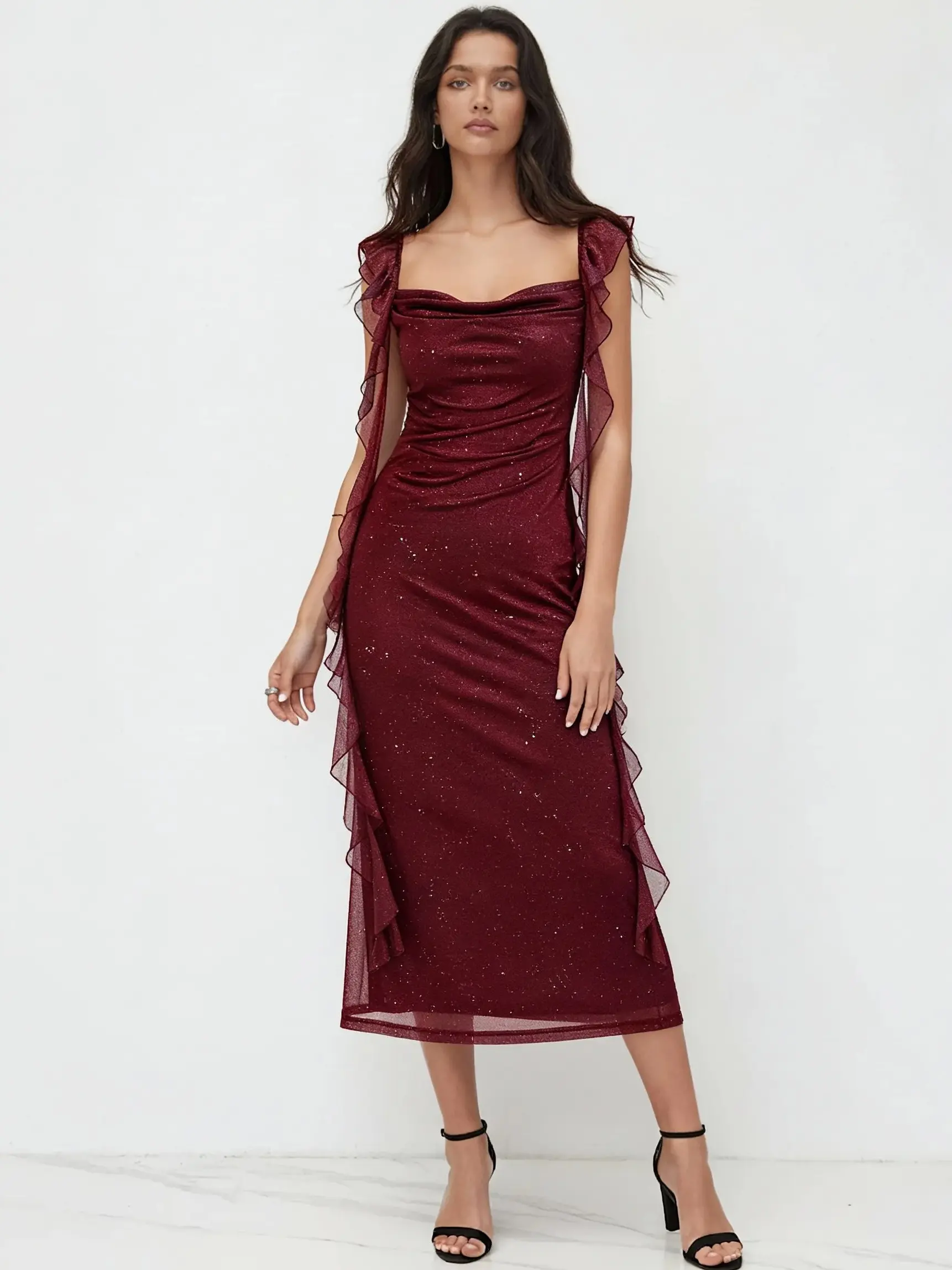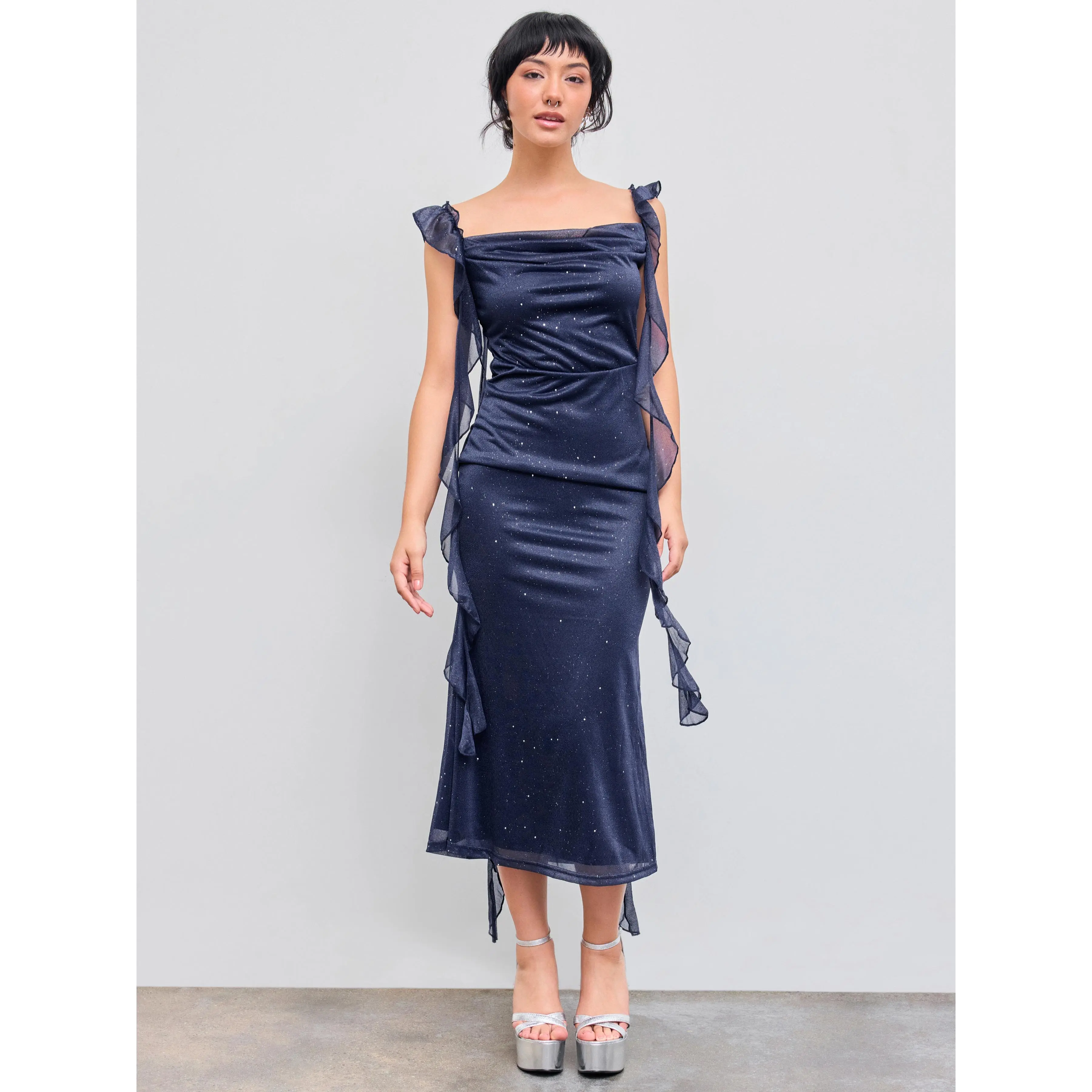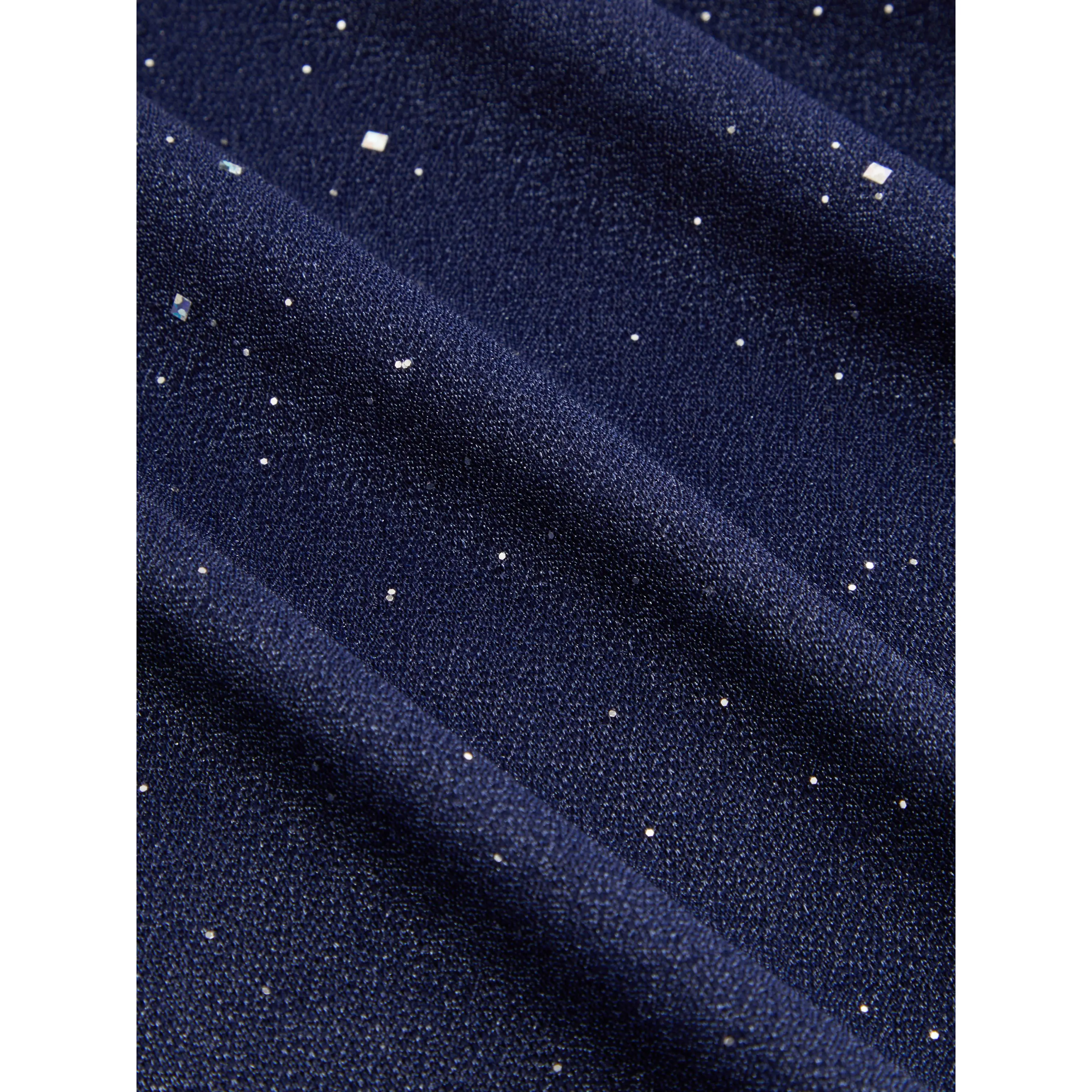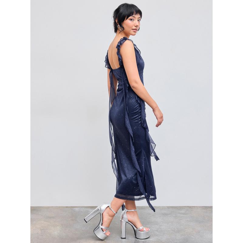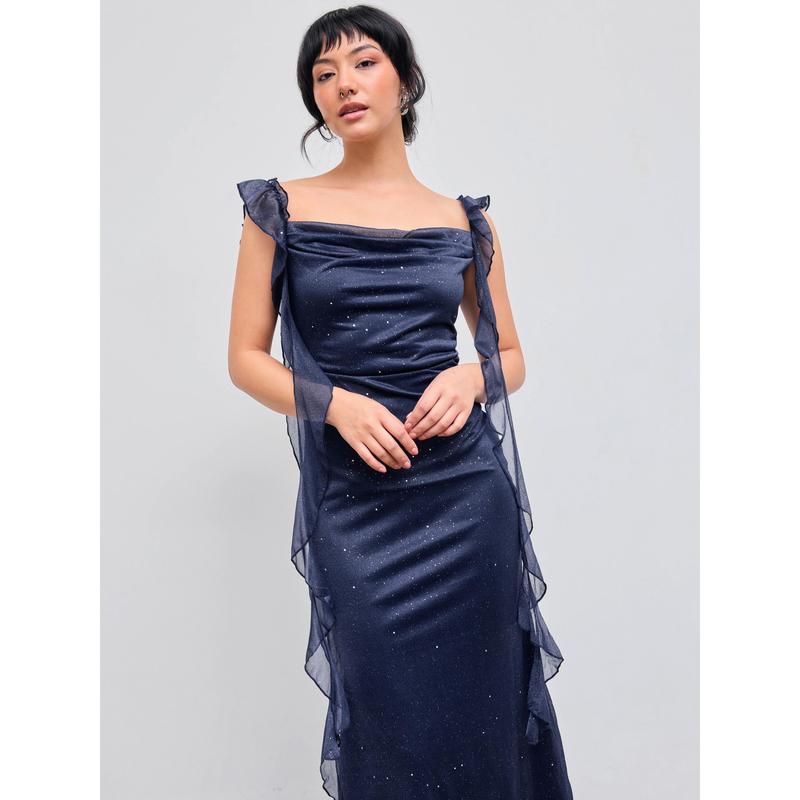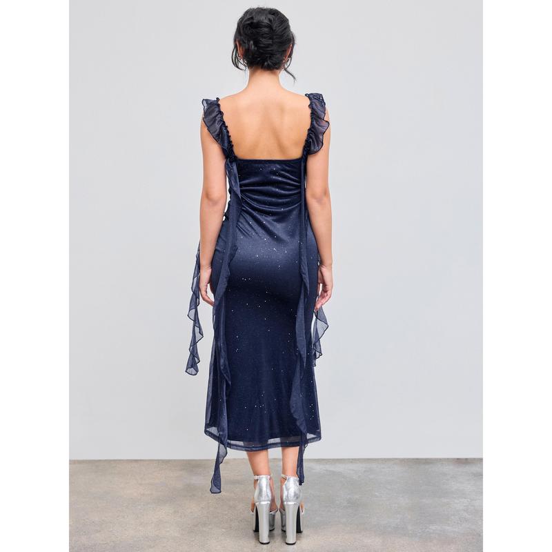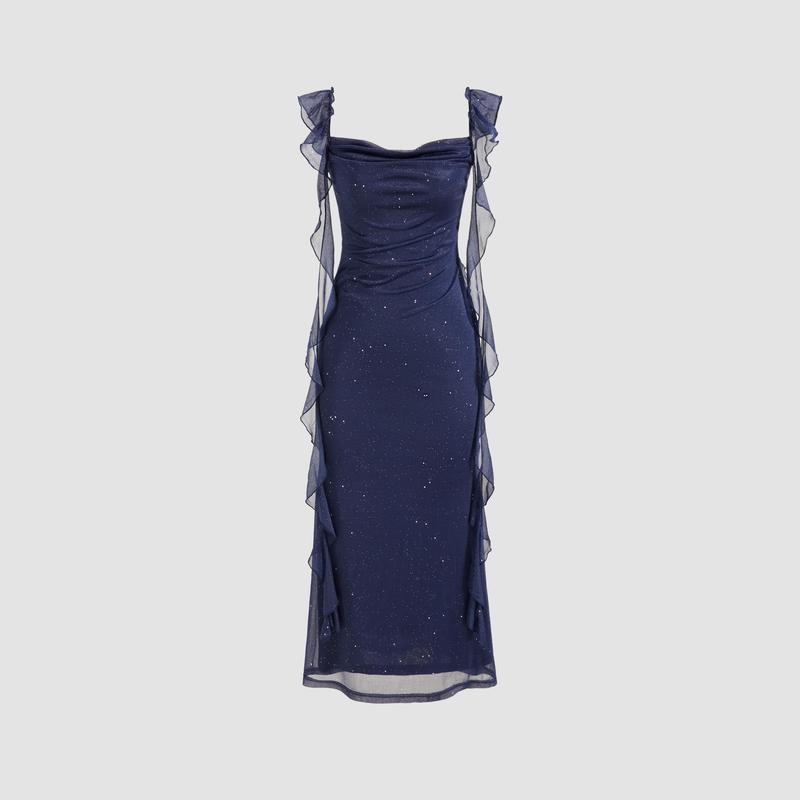 I really love this dress , I'm 5'0ft and 3 quarters tall and this dress doesn't touch the floor at all . In the picture of the product it doesn't show that it has sparkles on it but it actually does . Love that's its strechy and it's true to size .