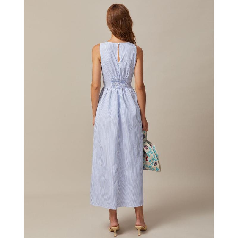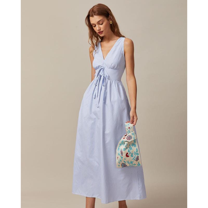 5. The Blue V Neck Shirred Striped Maxi Dress