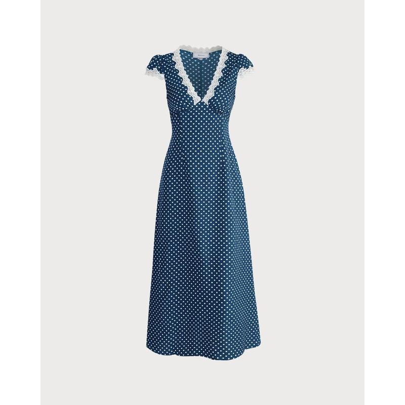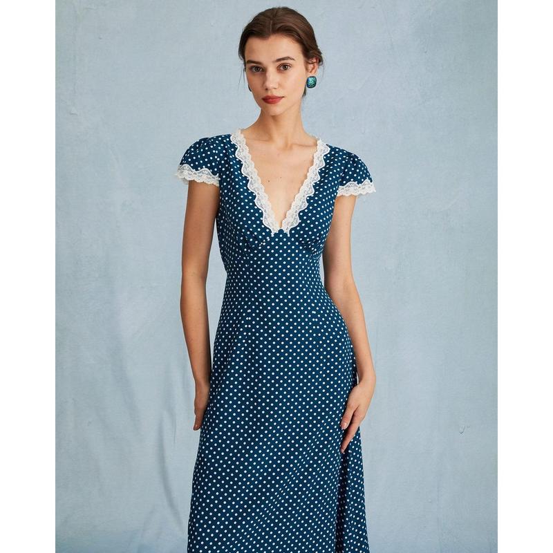 5. The Navy V Neck Polka Dot Lace Ruched Maxi Dress