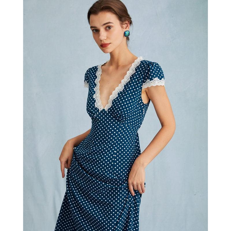 Details: - Ankle Length - Ruched - Polka Dot - Deep V Neck - Cap Sleeve - Polka Dot - Lace Maxi Dress