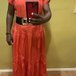 Love the color very vibrant. I am a plus size and was able to get into it...no stretch. Good quality material.