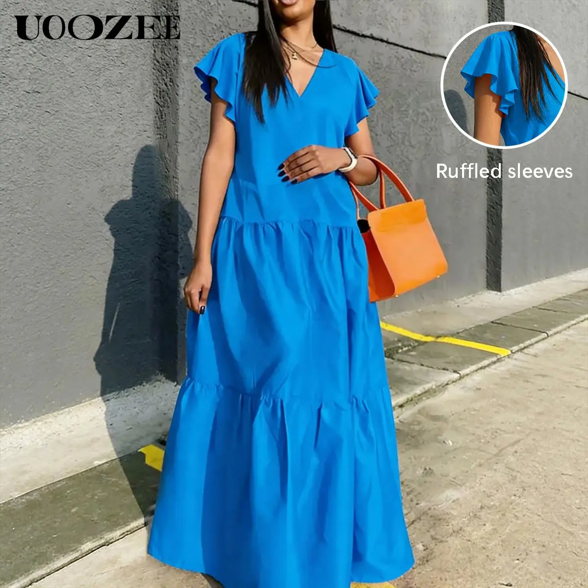 UOOZEE Women's Bright Chic Loose Short Sleeve Pleated Pocket Solid Color Slit V-Neck Maxi Dress Summer Casual Basic Cotton Blend Machine Washable Holiday Dress Womenswear Minimalist (Size is one size larger, it is recommended to order one size smaller)
