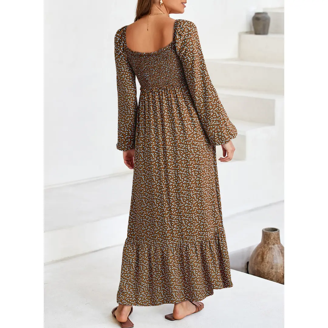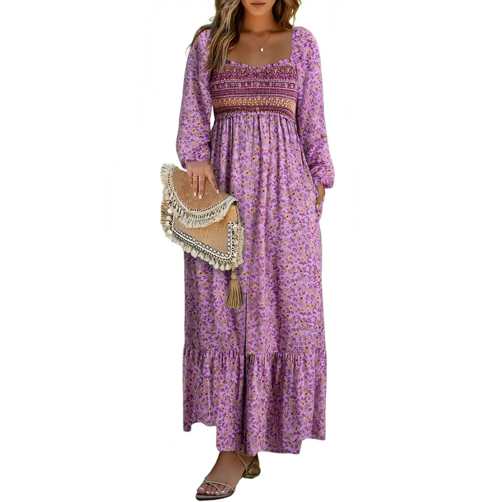 ·Dokotoo's women's maxi dress features a square neck, long sleeves, and a floral print. It includes decorative buttons front and stretchy smocked bust and waist. The dress has side pockets, a maxi length, and a flowy ruffle hem. It's an A-line, swing flared style, perfect for any body shape.
