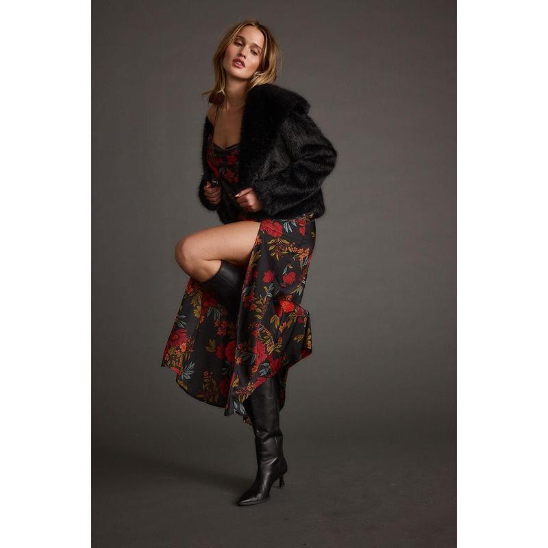Celebrate the newlyweds in style with the Natalia Black Floral Maxi Dress. This elegant black floral satin maxi dress features a cowl neck and a front side slit, making it a perfect choice for both ceremony and cocktail hour.