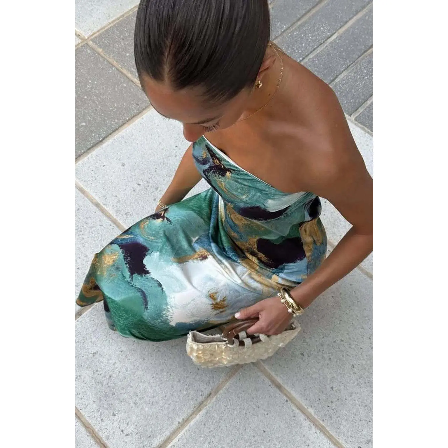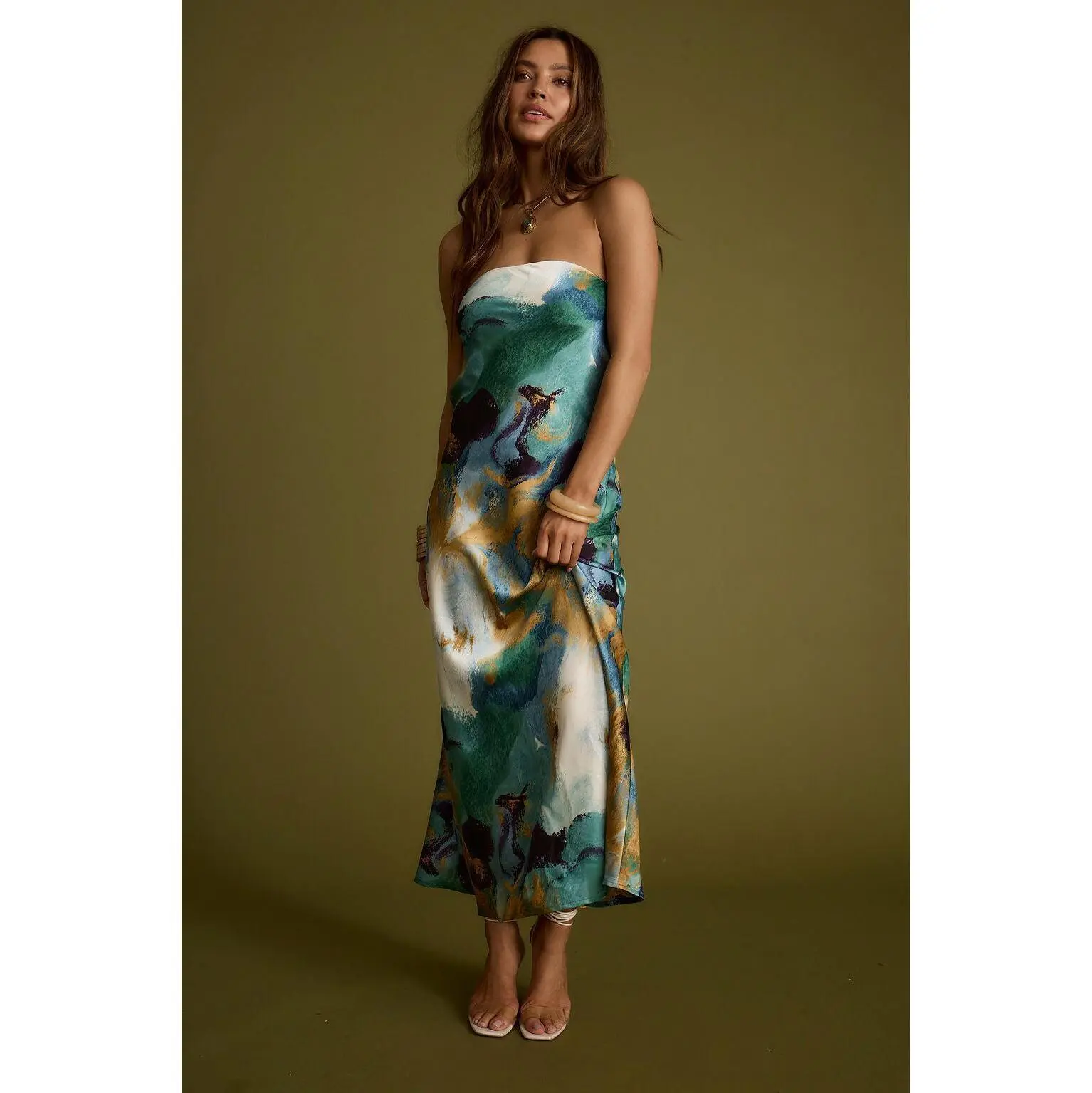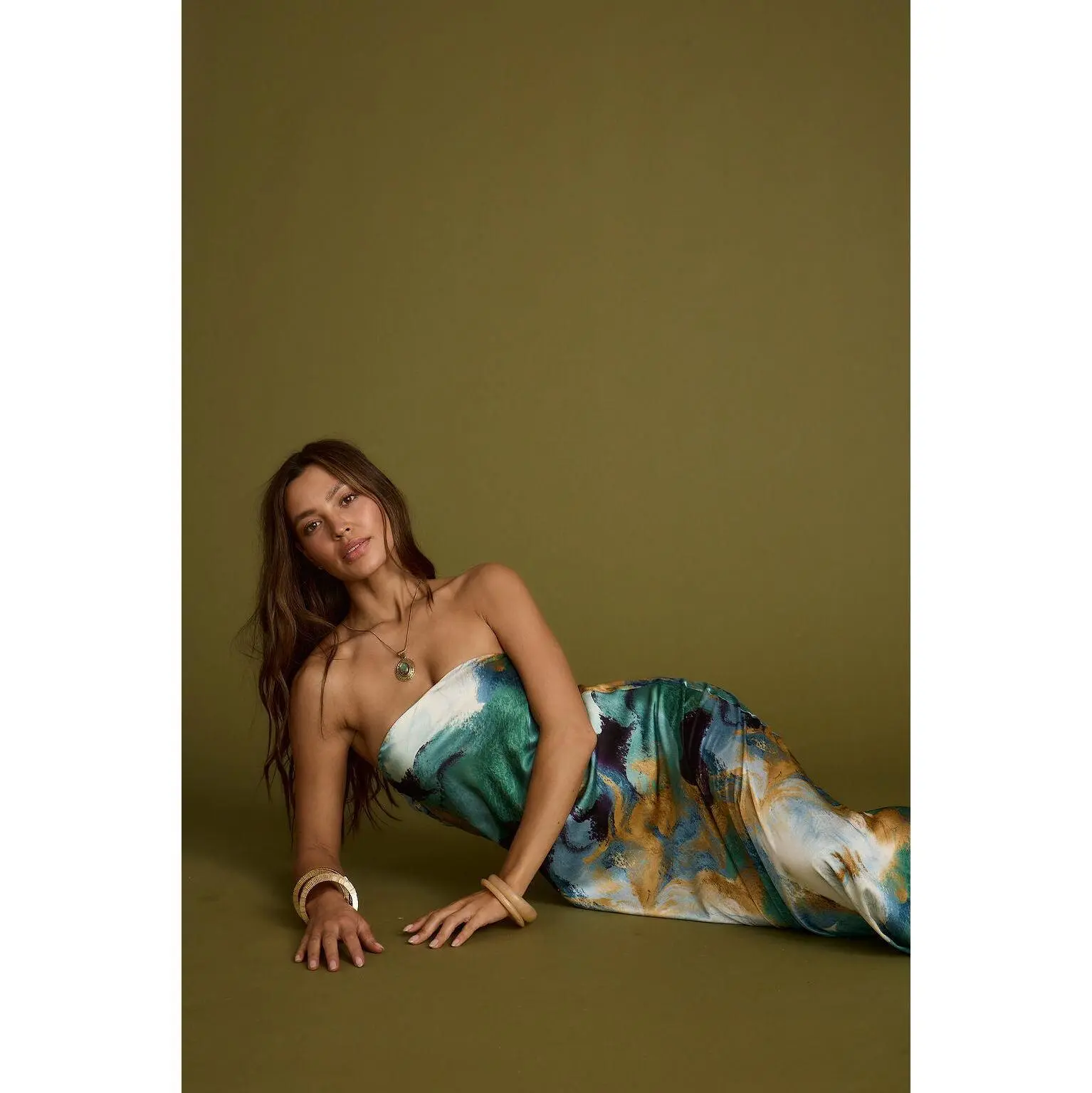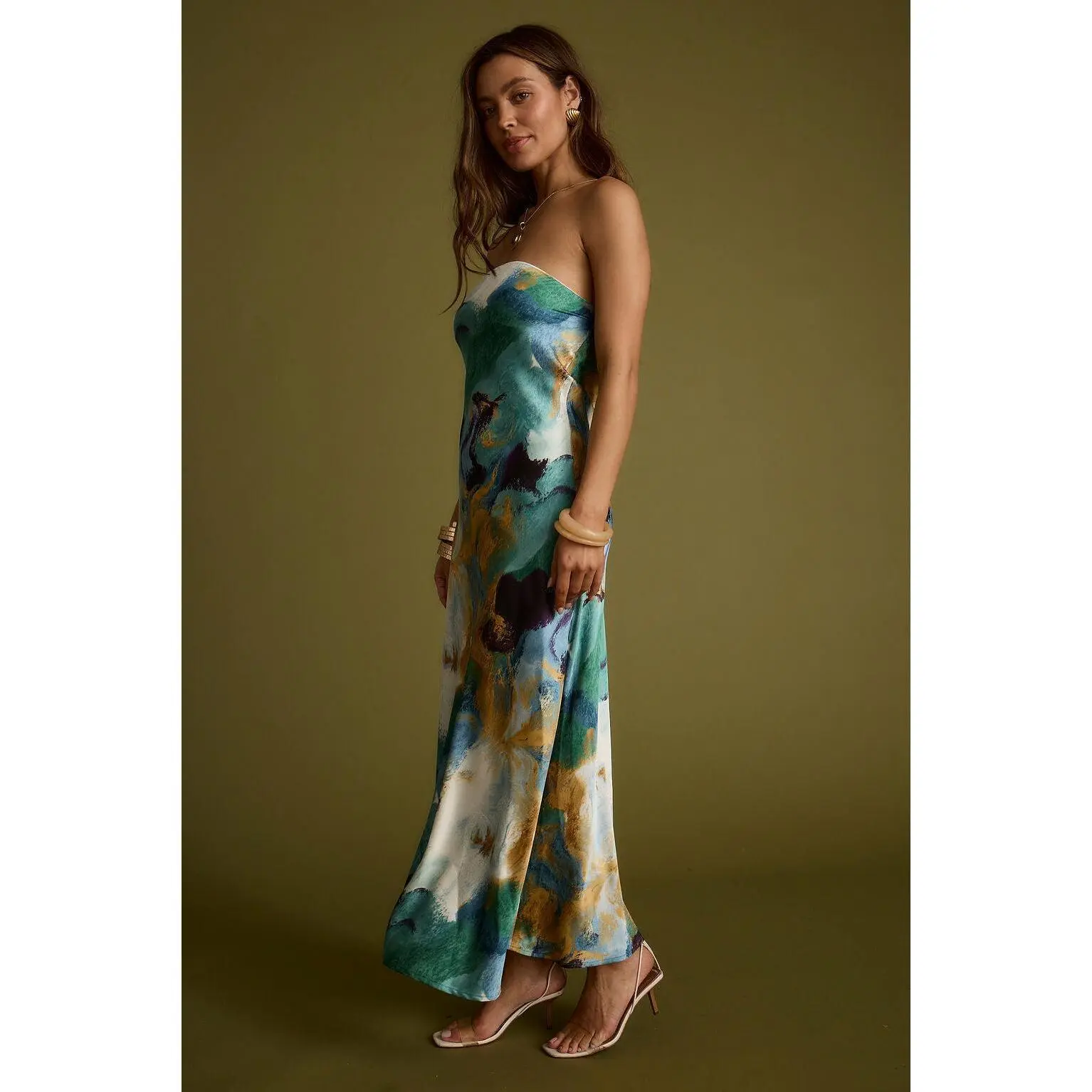 You named her the best selling dress to date - the Natalia dress. With the blue and gold watercolor print you love, now in a flirty strapless version. There's no better dress to celebrate the newly weds in than this. A rich blue and green watercolor print and soft satin texture with an elegant silhouette, the Natalia is fitting from the ceremony to cocktail hour and through the rest of the evening.