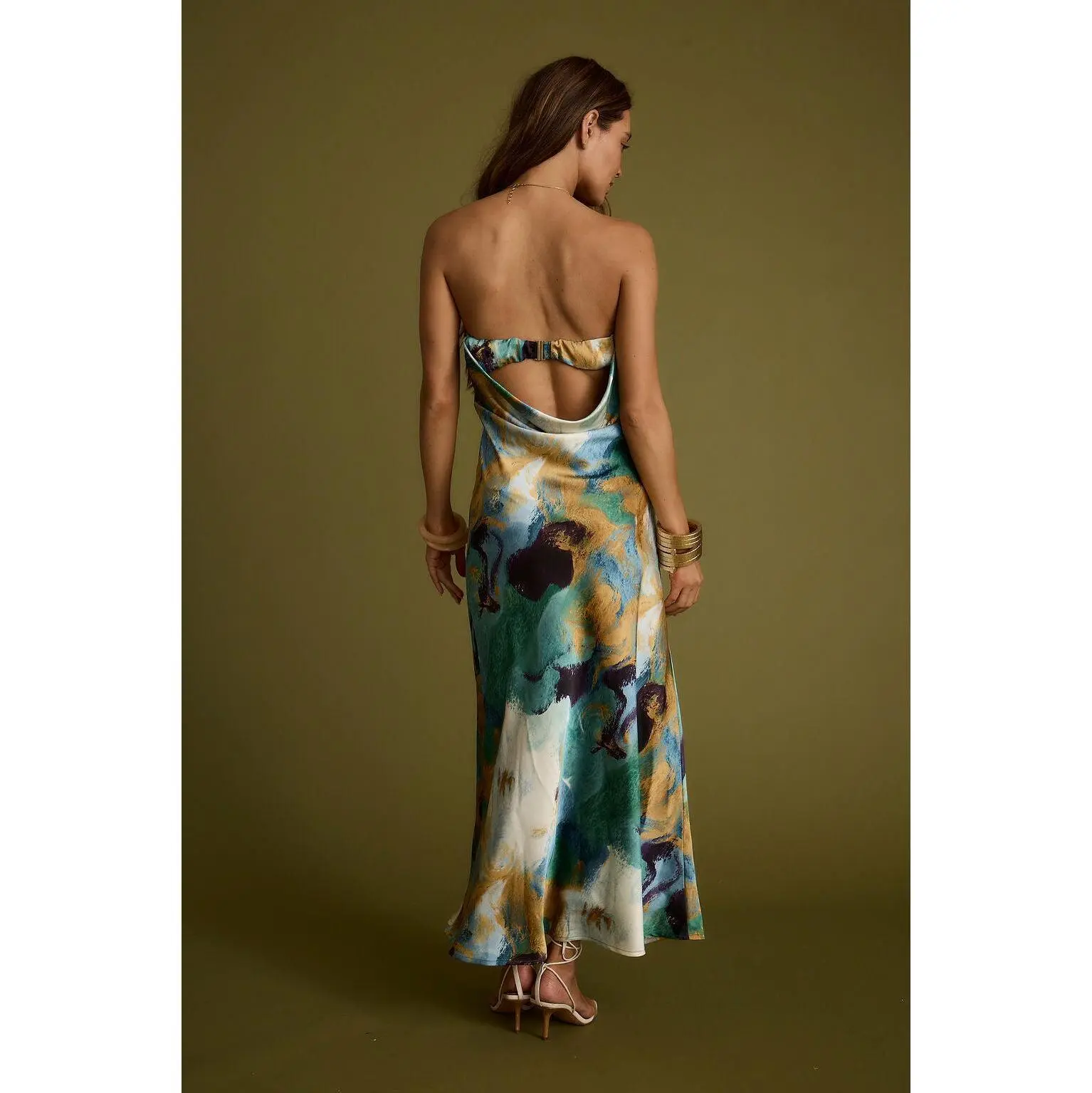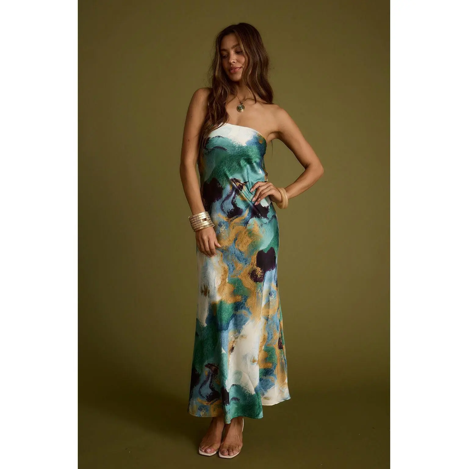 5. Natalia Blue and Gold Watercolor Strapless Maxi Dress