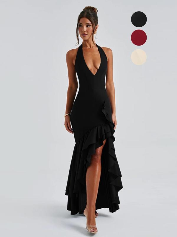Women's Plain Deep V Neck Ruffle Trim Dress, Elegant Fashion Casual Halter Dress for Daily Outdoor Wear, Women Formal Dress for Summer, Womenswear, Halter Sleeveless Dress