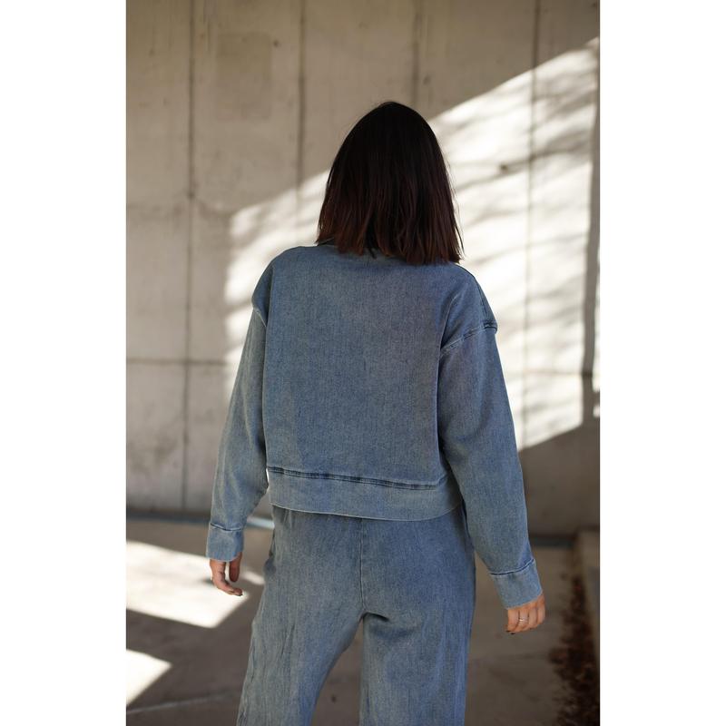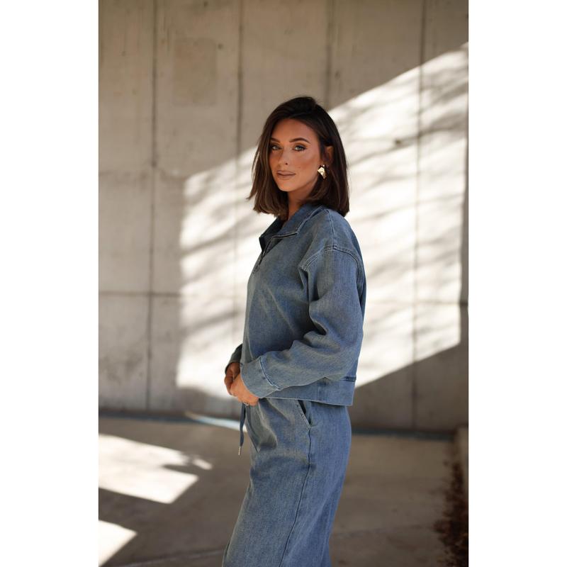 Elevate your casual wardrobe with our Dressed Down Denim Zip Up. Featuring a collared neckline and drop shoulders, this quarter zip top offers a relaxed fit for comfort and style. The cropped length adds a trendy touch, making it the perfect choice for shopping or a chic brunch. Versatile and effortlessly cool in classic denim.