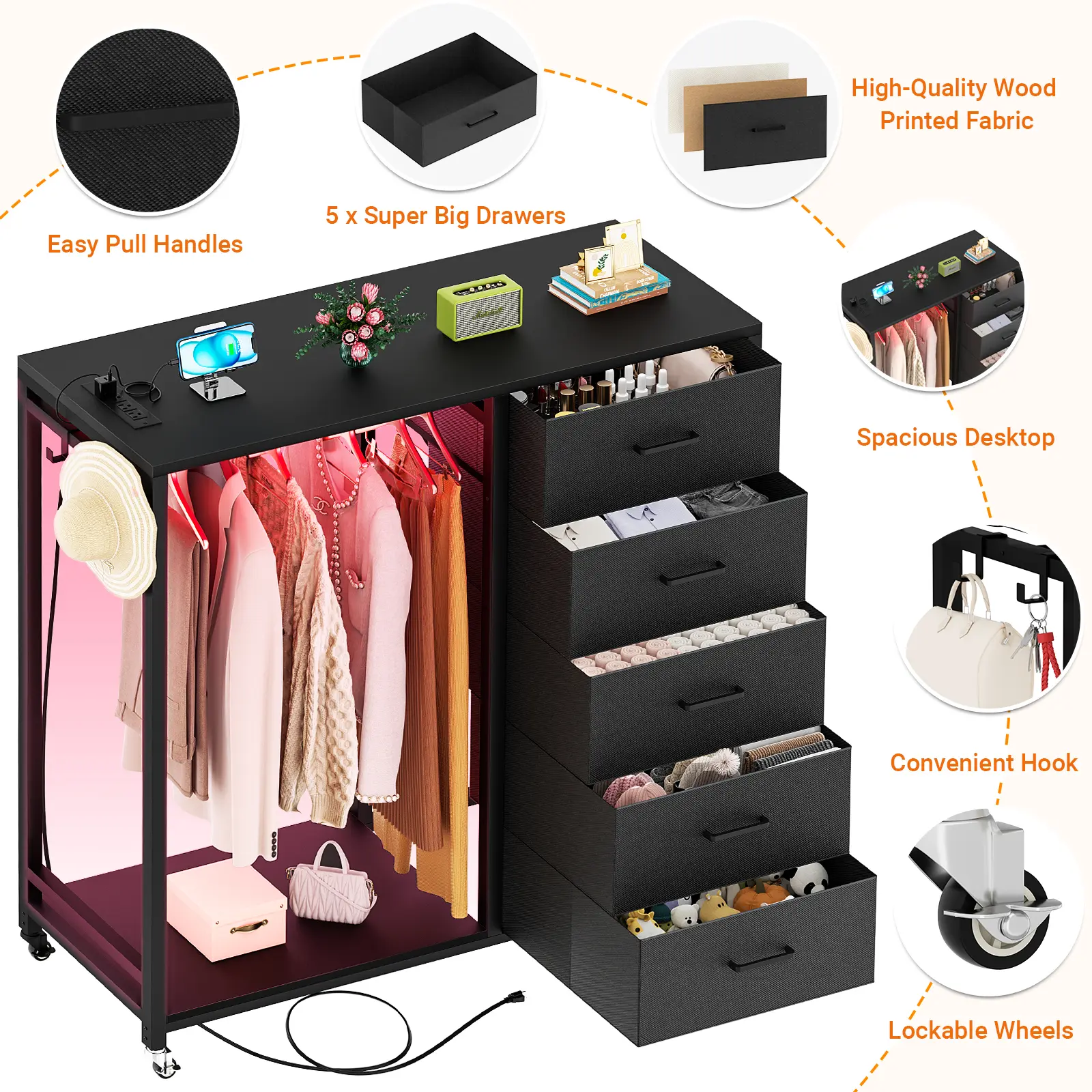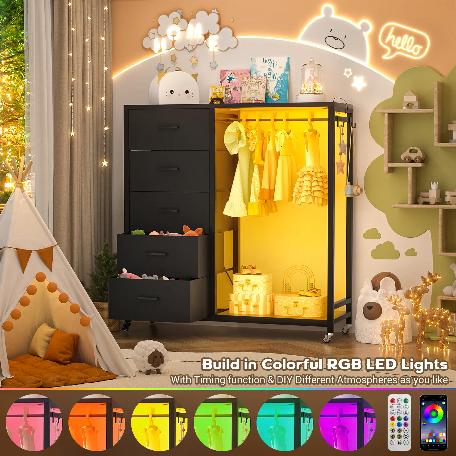·【Charming and Magic LED Lights】 This chest of drawers equipped with 6000+ colors of light strips, can DIY any colors you like. With its timing and rhythm with the music function, you can enjoy and create any atmosphere at home.