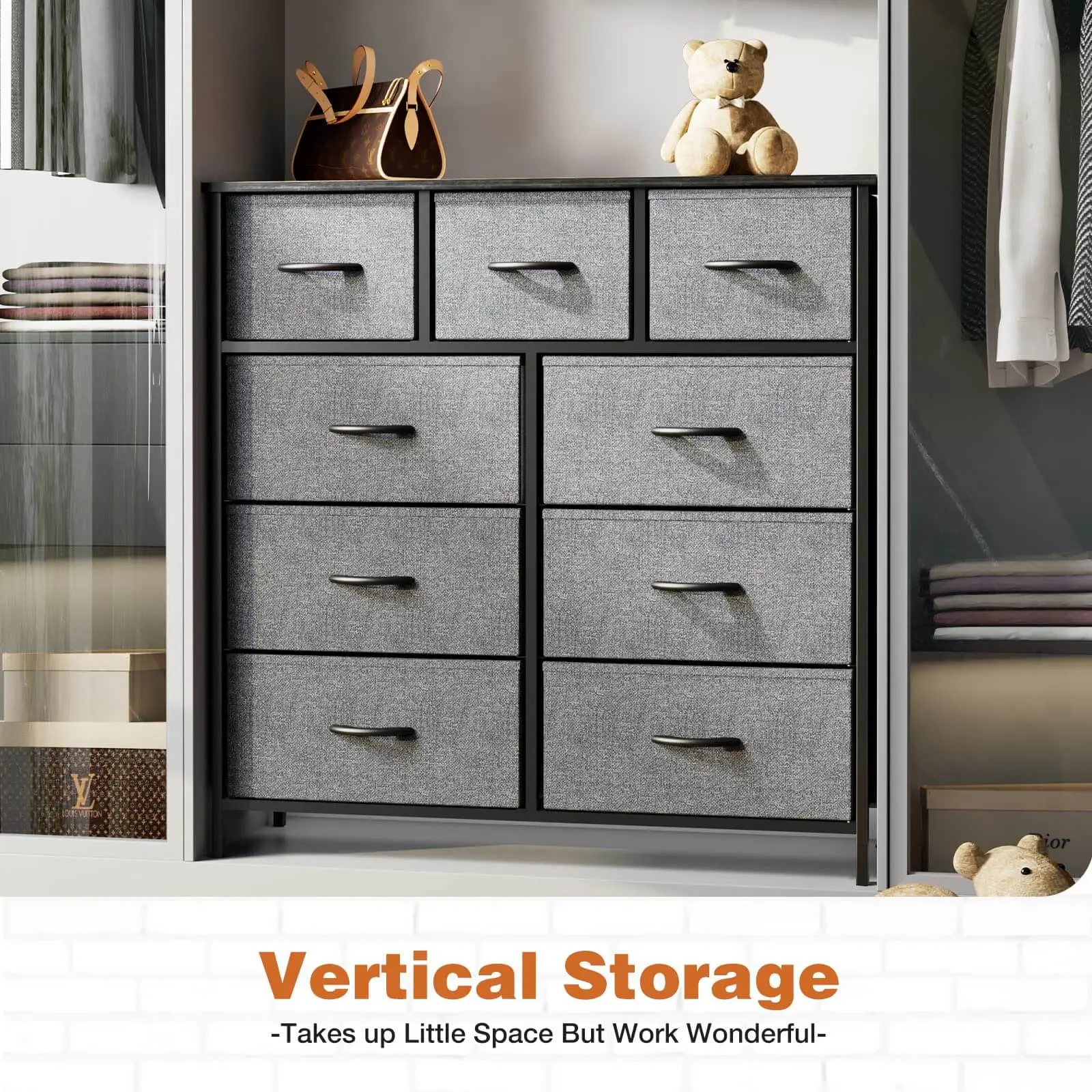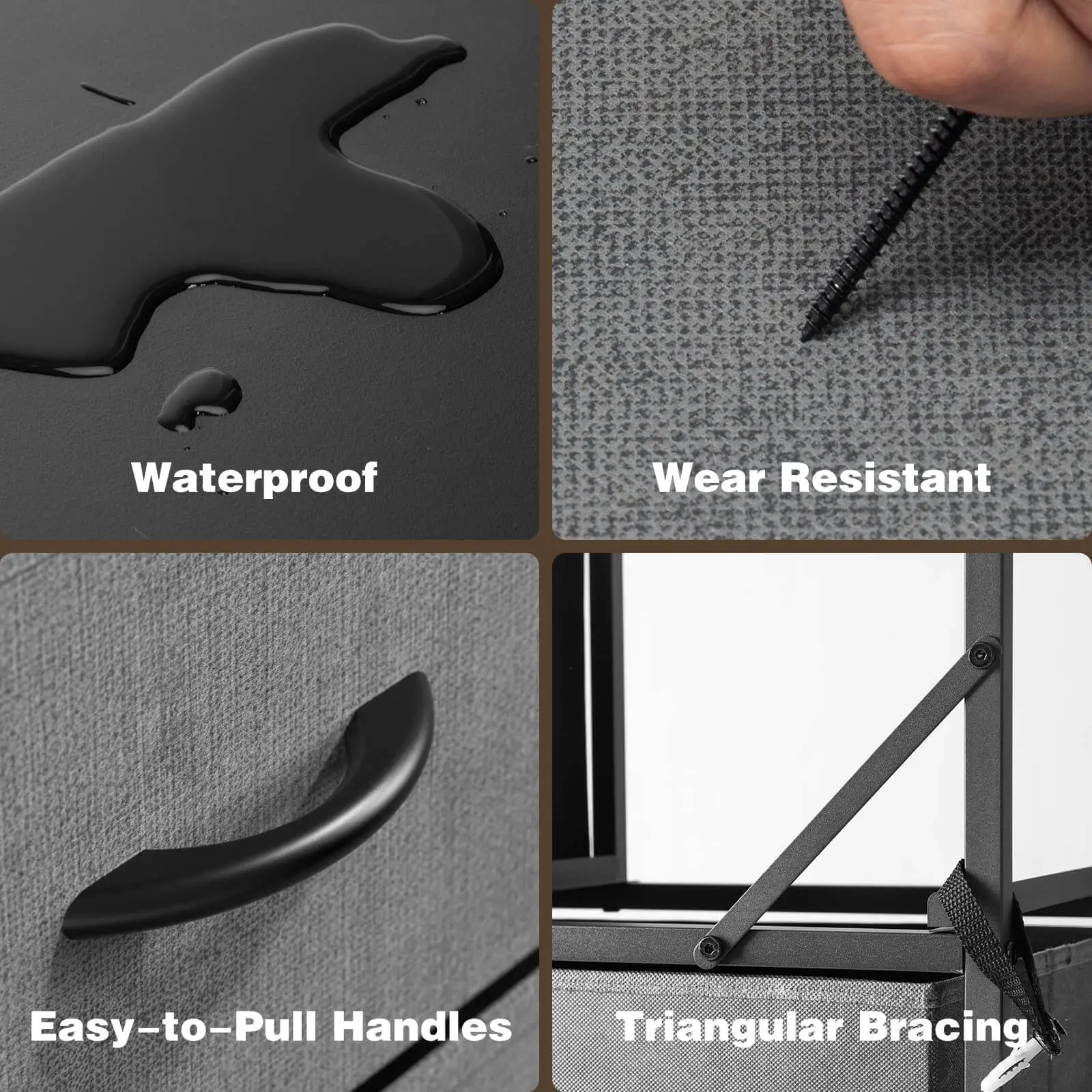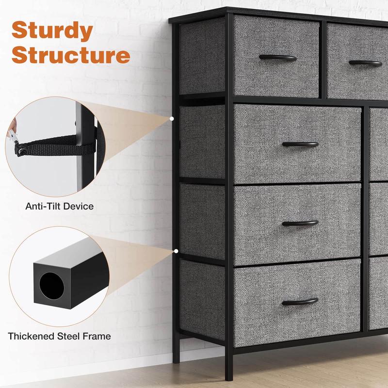 ● This fabric dresser combines water-resistant MDF board with a durable steel frame. A cross stable structure to make it sturdy under load 66lb. Anti-tipping accessories are also equipped to prevent accidents.