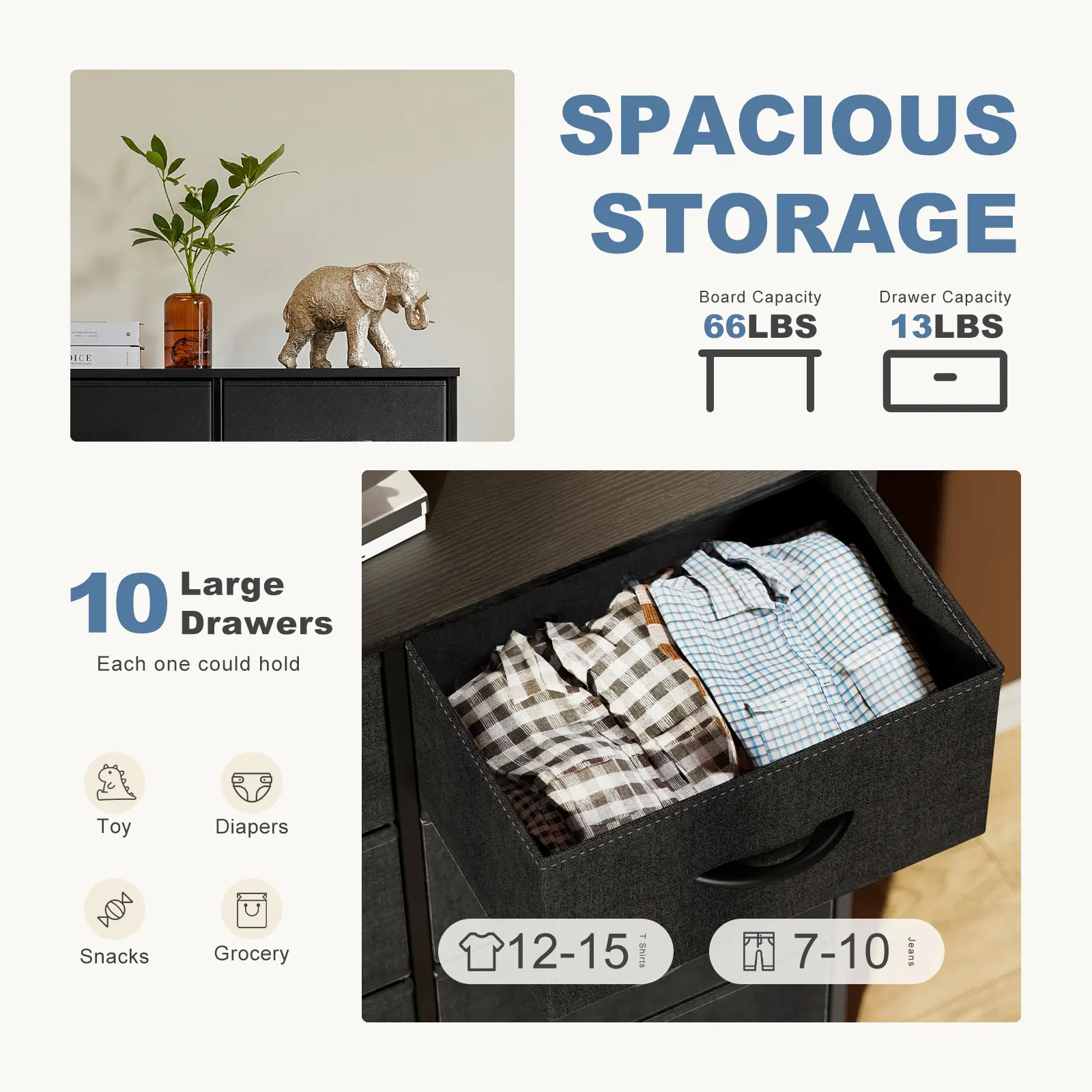 The reason I’m giving this 4 stars and not 5 is because they sent the wrong color. I bought the tv stand in grey and ordered the dresser in grey and they sent me black. I didn’t realize until today when I looked and put it together that the drawers don’t match the other drawers I have.