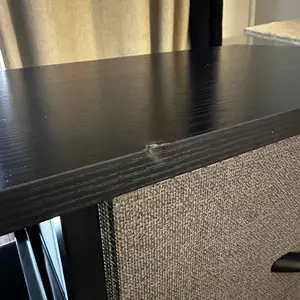 Disappointed with this order. As you can see from the pics, there is damage to the board. It appears that the board is dry rotted. Unfortunately, two of the screws were lodged in the wholes, removing the gold rings from the board. I purchased a smaller dresser from another seller and had no issues.