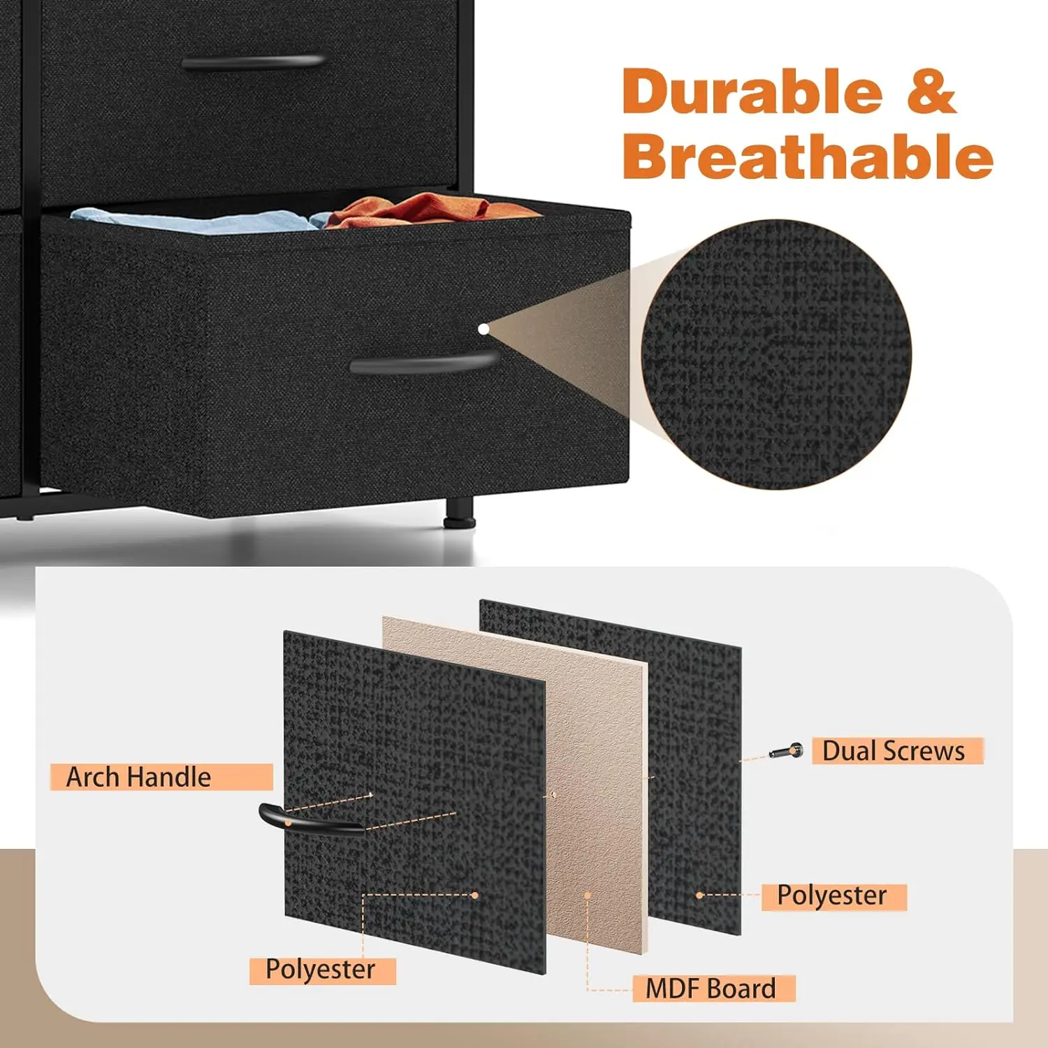 ·【Quality Construction】This fabric dresser combines water-resistant MDF board with a durable steel frame. a cross support bar to make it sturdy under load 66lb. Anti-tipping accessories are also equipped to prevent accidents. With 4 adjustable feet, you won’t have to worry about stability, and it is also adaptable to different spaces.