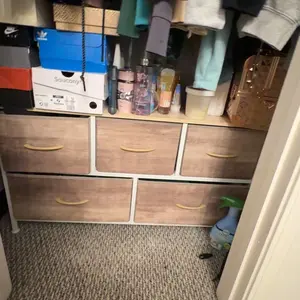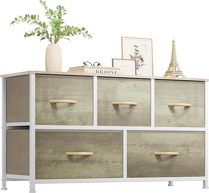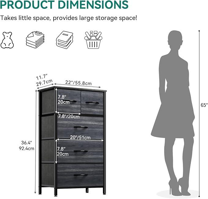 QUALITY CONSTRUCTION - Made from reliable metal frame and durable MDF wooden top; 5 removable and foldable drawers; Easy-pull fabric handles allow drawers to be conveniently opened and closed; 4 adjustable plastic feet protect your floor from scratches
