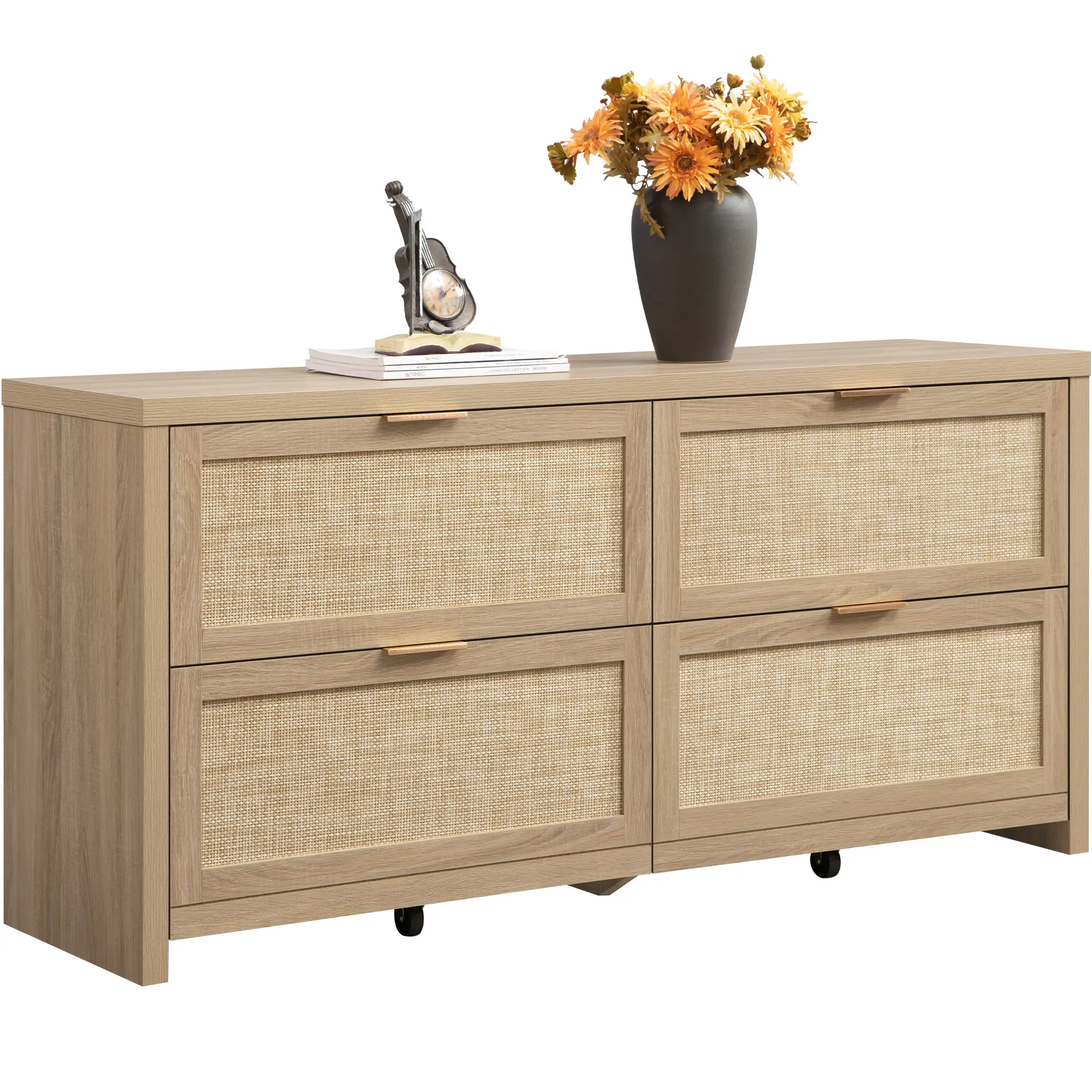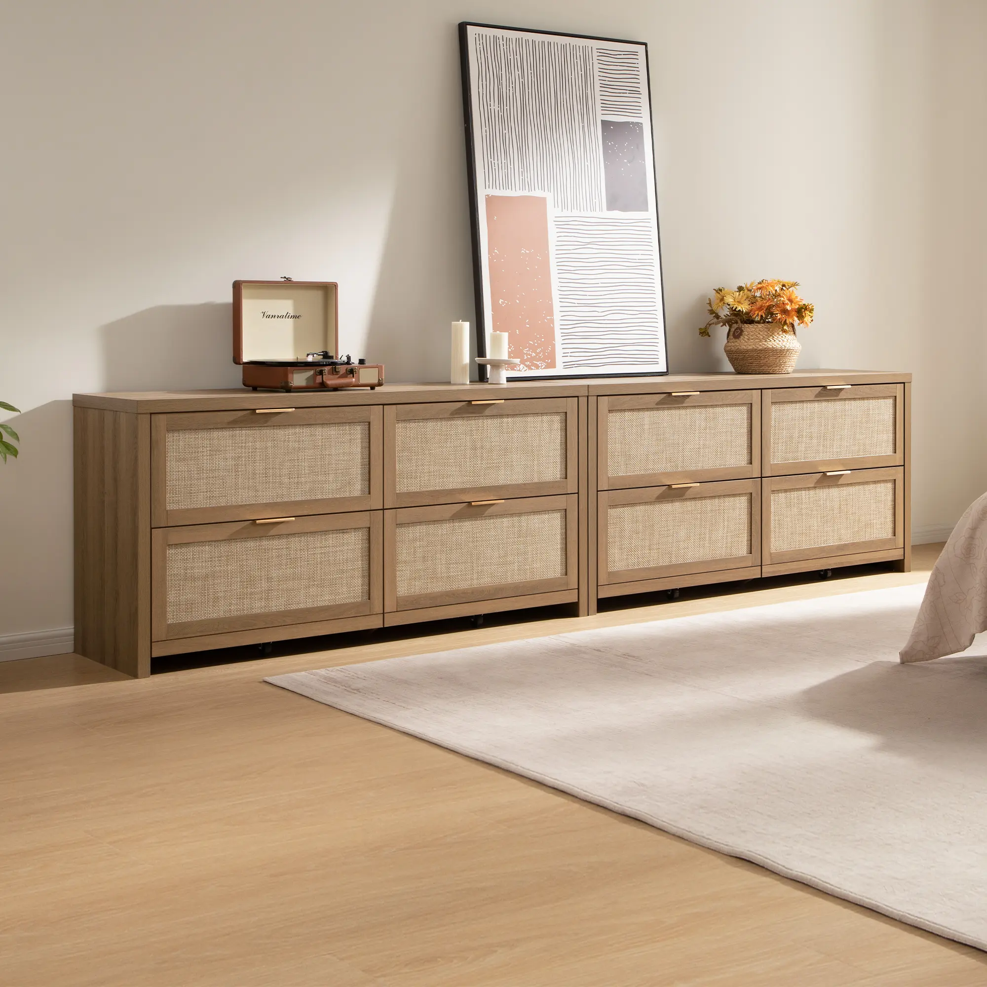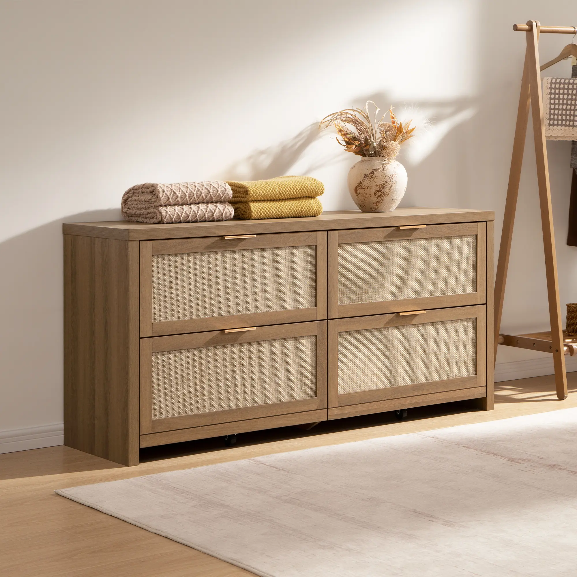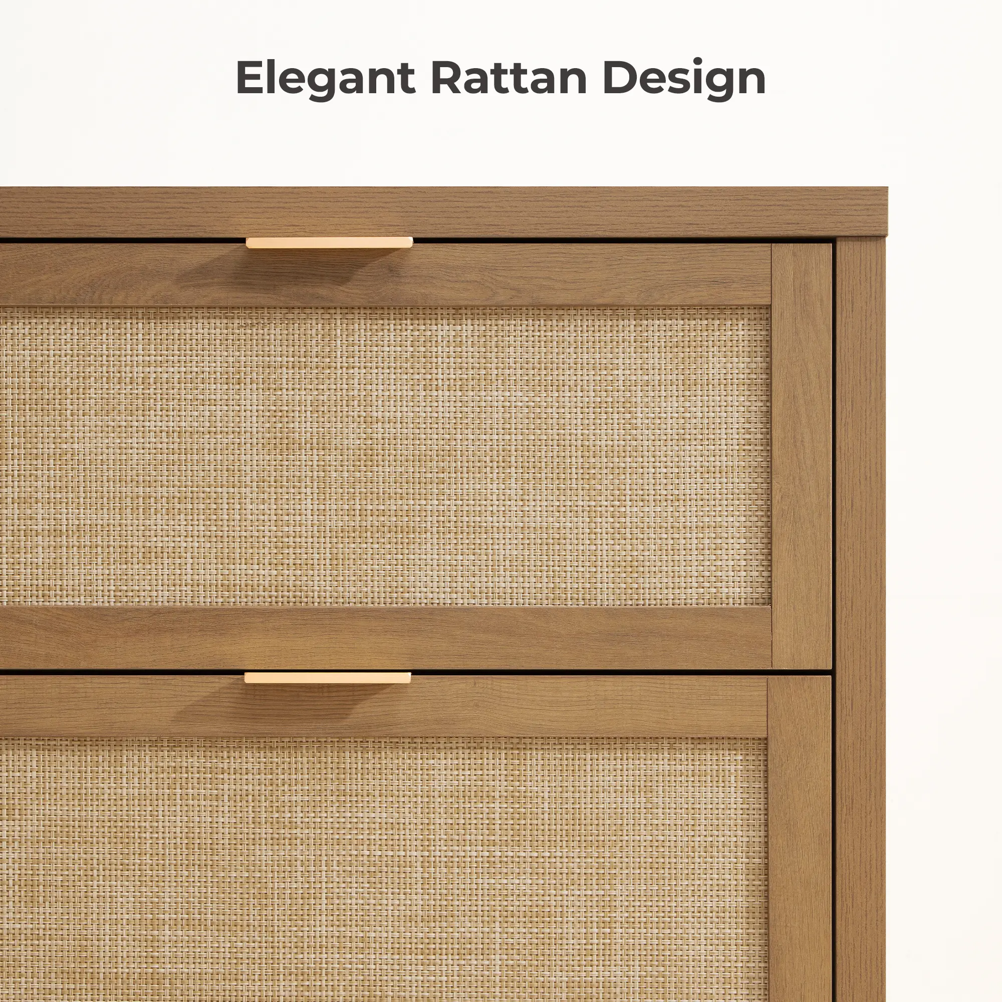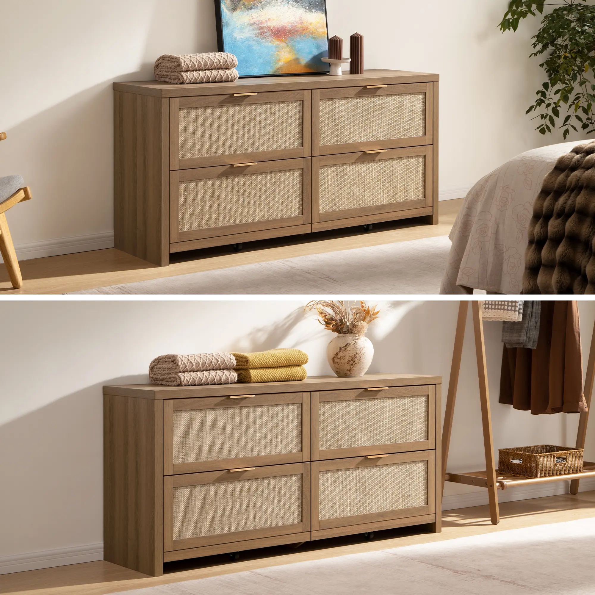 ·【Bohemian Charm with a Warm Feel】- This boho rattan dresser features rattan mesh drawers, natural wood panels, and golden handles, creating a warm, vintage Bohemian style. It will bring a cozy and inviting vibe that you'll love coming home to.