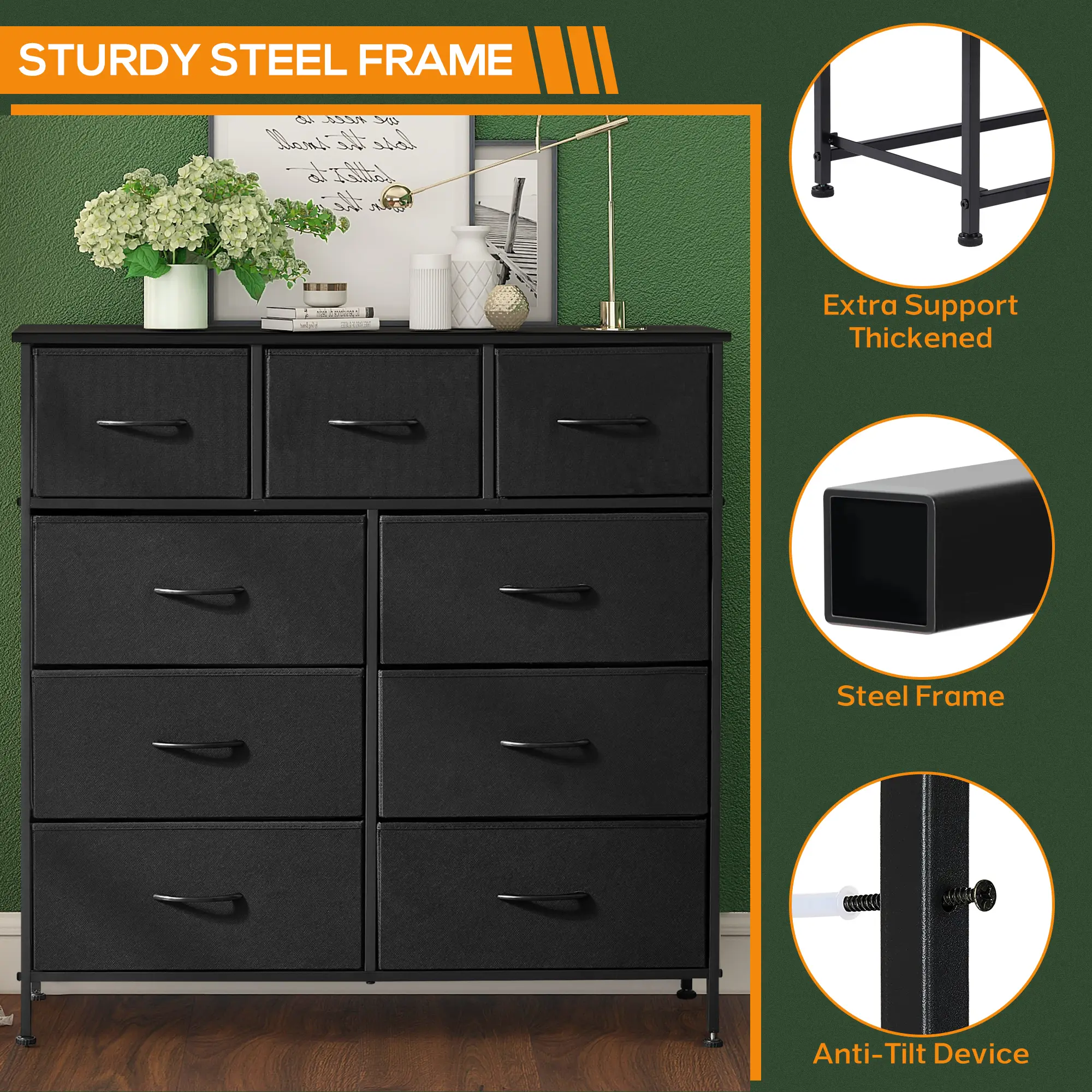 【Drawer Dresser with Sturdy Frame】This dresser for bedroom is built with a sturdy metal frame to ensure stability. It is equipped with 4 adjustable feet and you can effortlessly balance the dresser in tight spaces. Moreover, it comes with an anti-tilt device that can be utilized when mounting the bedroom dresser sets to the wall, preventing accidents caused by uneven floors or children climbing.