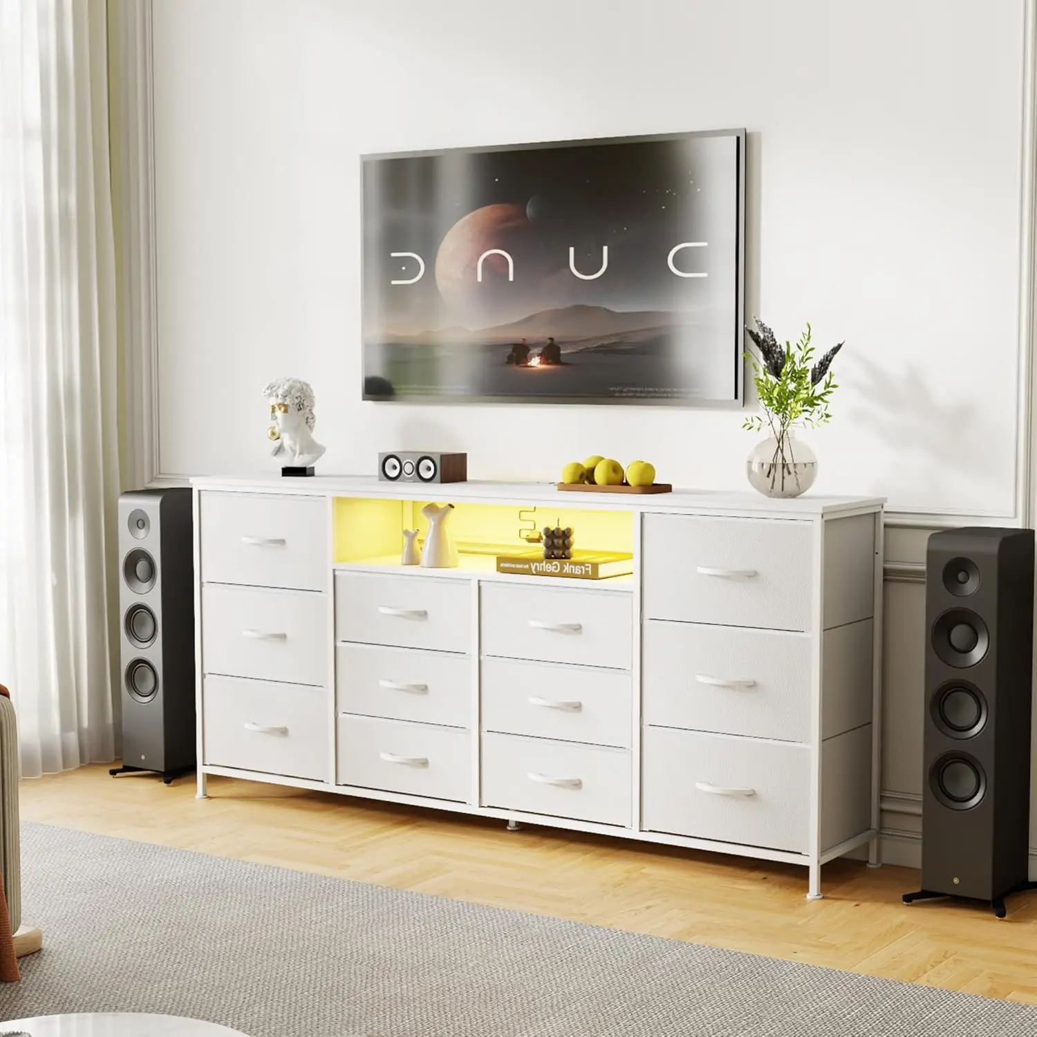 ยทใIntegrated Charging Station & LED Lightsใ This 12 drawer dresser features a built-in power strip with 2 AC outlets and 2 USB ports to charge your phone or laptop. The smart LED lights offer 20 colors and multiple modes, creating a modern ambiance for your bedroom TV stand.
