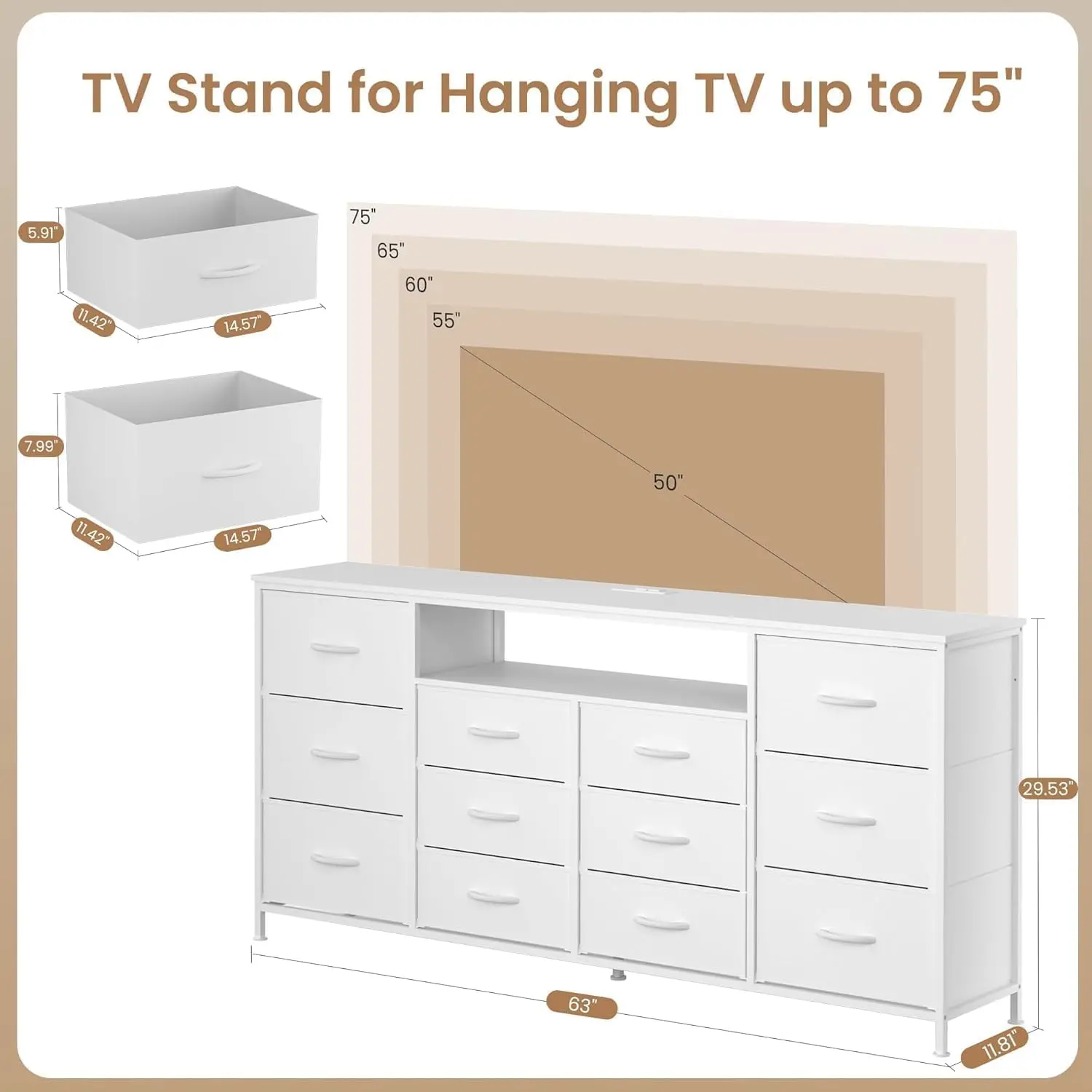 ยทใLarge Storage Capacity & Wood Shelvesใ Measuring 29.53" W, this long dresser offers a spacious wood top for a 75 inch TV. Two-tier open storage shelves provide quick access to daily items, while 9 deep fabric drawers keep blankets and clothes organized and dust-free.