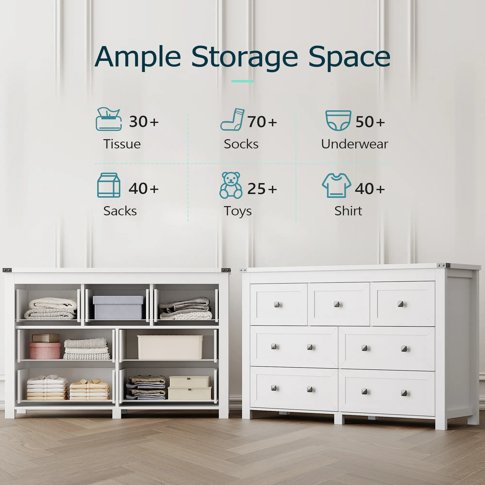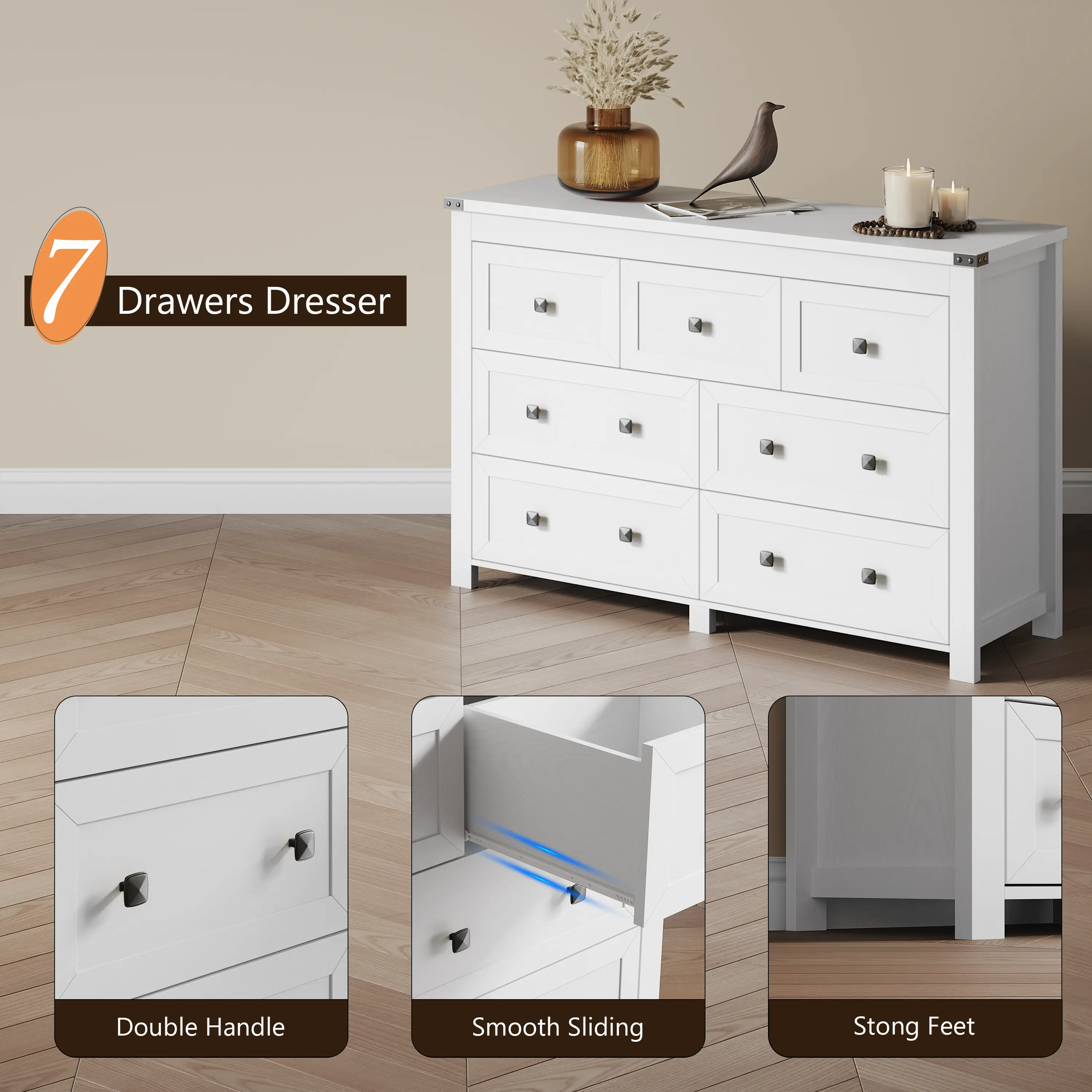 ·【Versatile Storage】This wooden dresser for bedroom use also serves as an ideal storage cabinet in your living room. It doubles as a TV stand and stores electronics, photos, and more, making it your go-to drawer storage solution