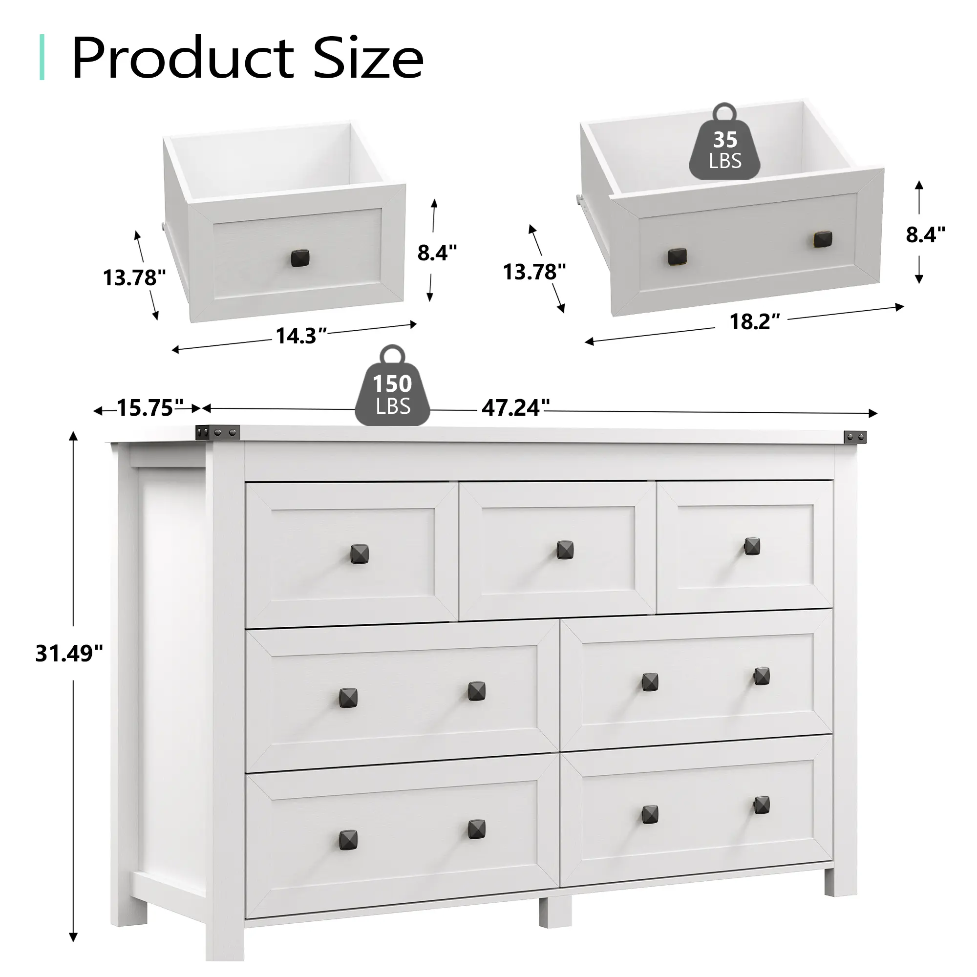 ·【Sturdy & Durable】The bedroom dresser is made of durable P2 engineered wood for long-term use and scratch resistant. The thicken dresser legs and anti-tip device made the dresser not slide easily, providing great durability and stability. The top surface of the dresser can hold up to 150 lbs and each drawer will hold 11 lbs or 33 lbs