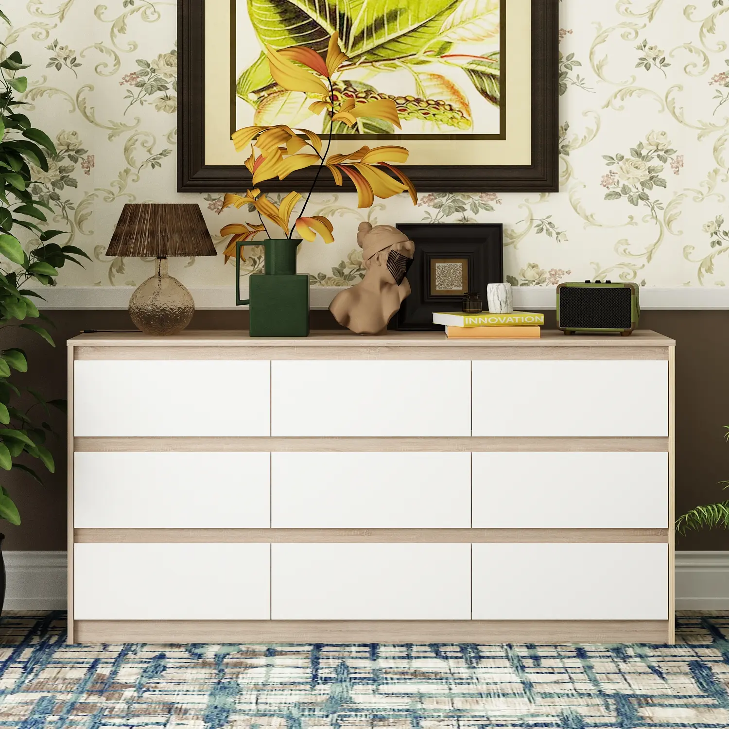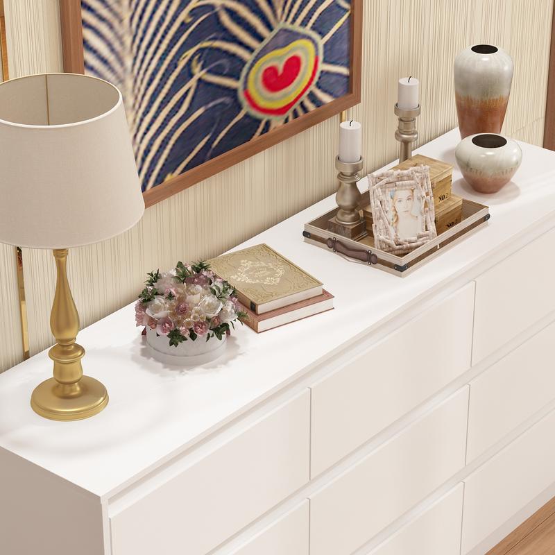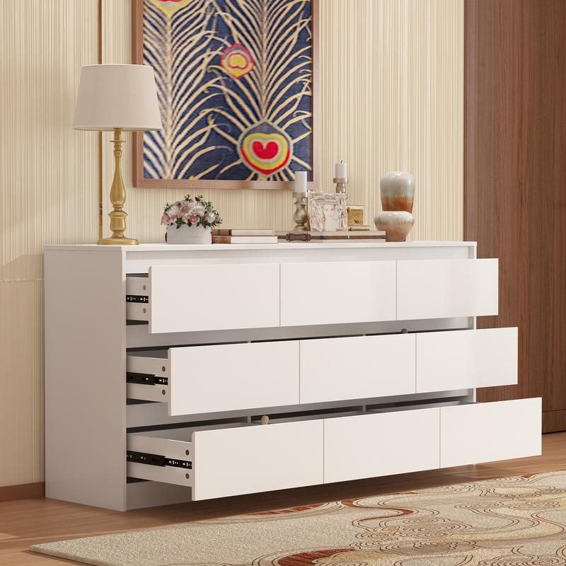 ·Sufficient Storage - Wide 63 inch tabletop allows you to display photo albums, vases, fish tank, decorations and so on. You can also treat it as a small bar with drawer storage. Featuring 9 spacious drawers, each of which has a depth of 13.8 inch, this white dresser for bedroom provides enough room to store your clothing, souvenirs, containers,etc.