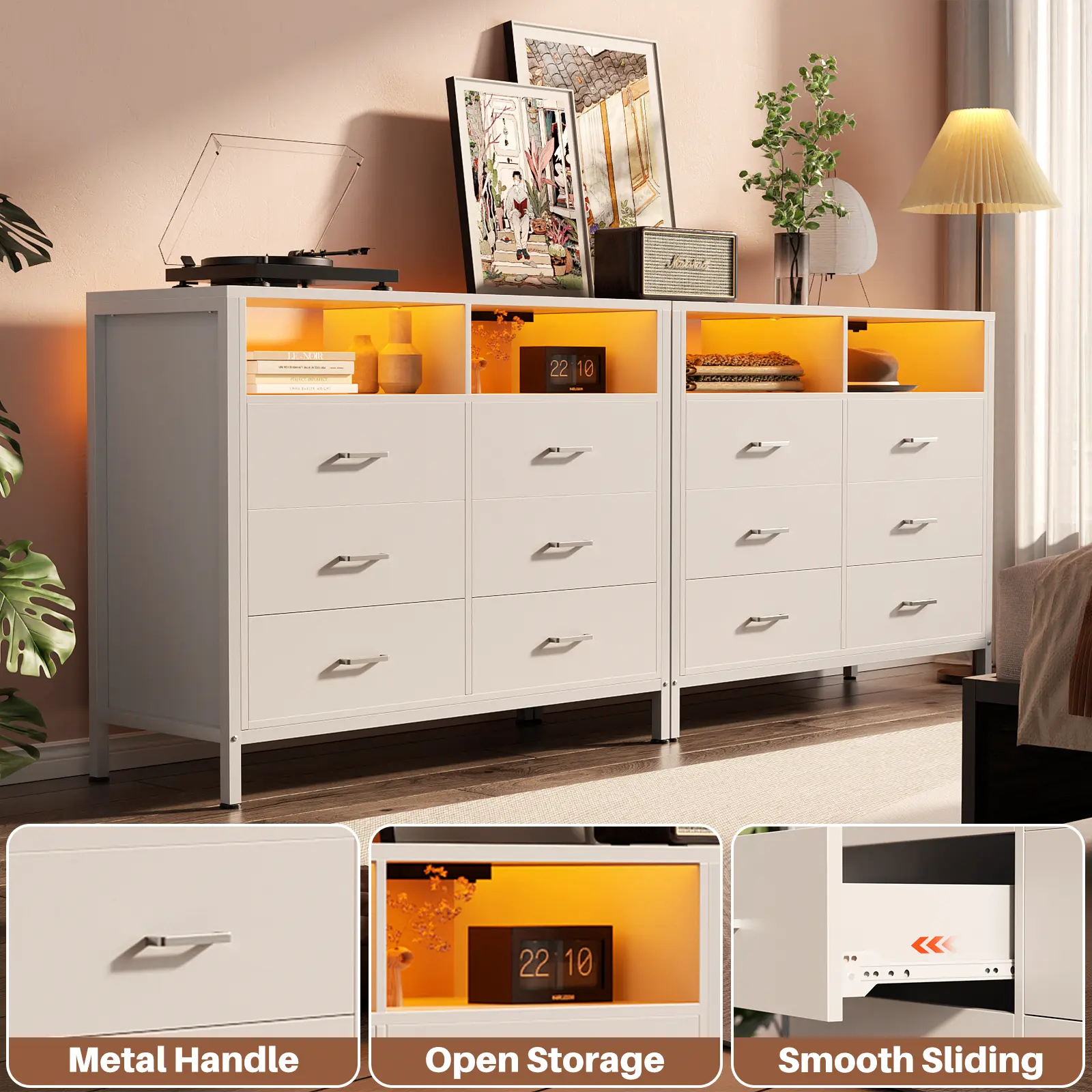 ·Stylish and Modern LED Light: The 6 drawer dresser is a contemporary take on a simple look. Top open cabinets equipped with smart light strips, You can choose from 60000 colors and 29 dynamic modes. The built-in mic makes the light's color change with the ambient music, easily creating a romantic, relaxed, and cheerful party atmosphere.