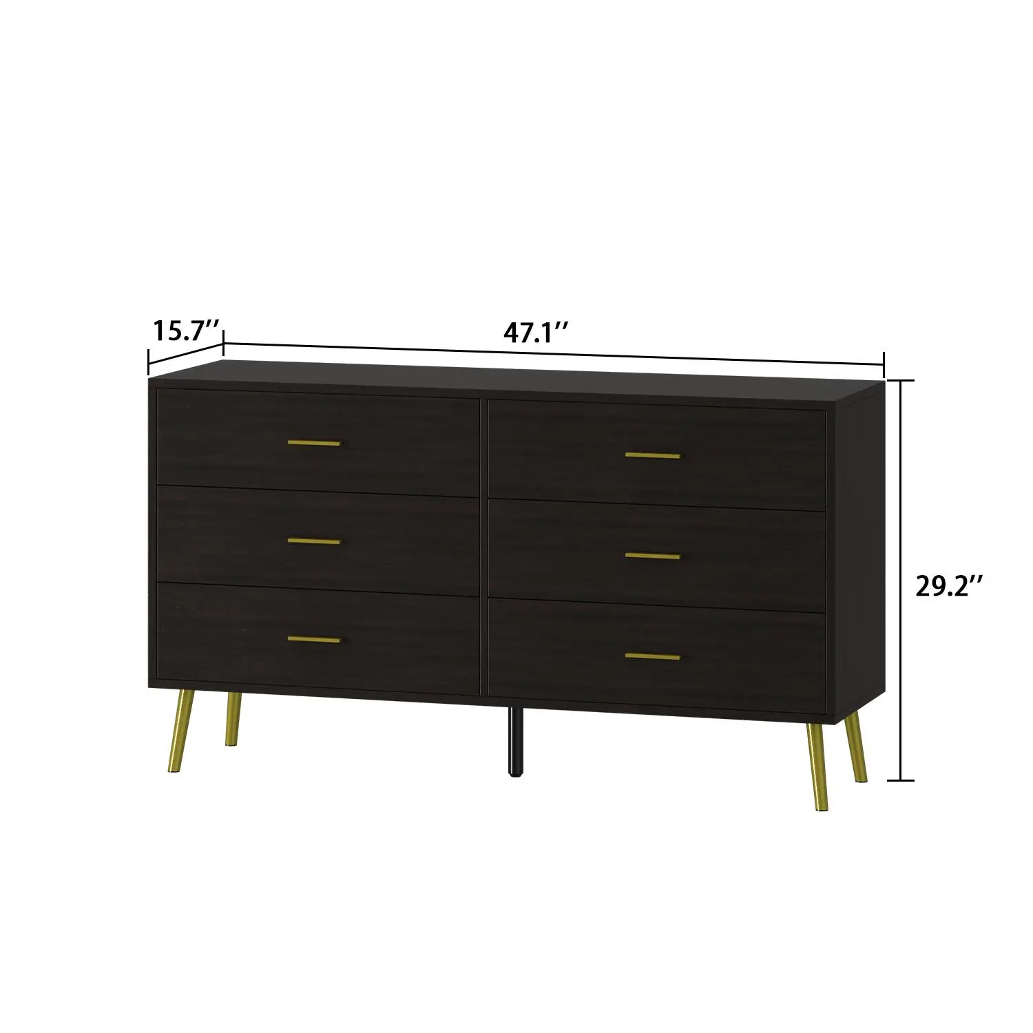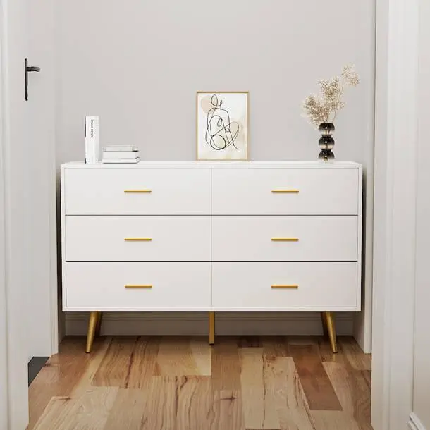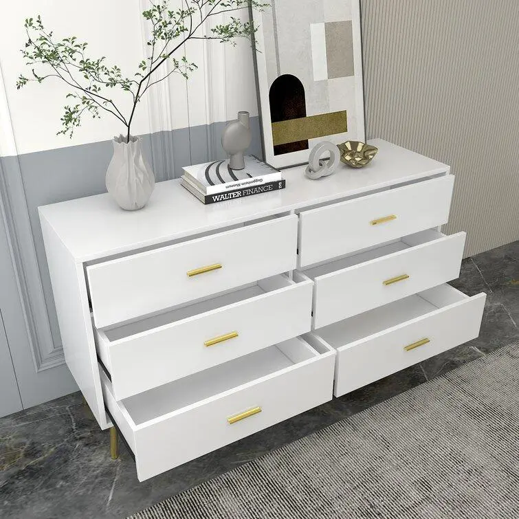 ·Modern & Contemporary - This basic 6 drawer dresser would be a nice storage companion for any home. The simple and elegant appearance, along with clear lines, gives a fresh feeling for your living space. The golden handles and metal legs make the color of this drawer no longer monotonous.