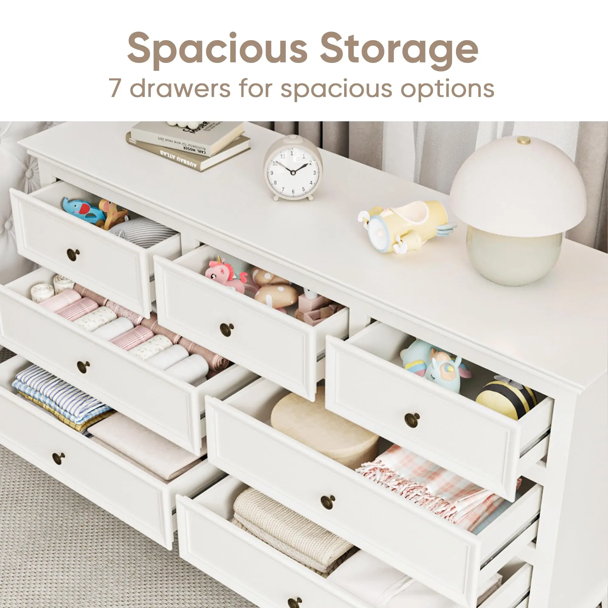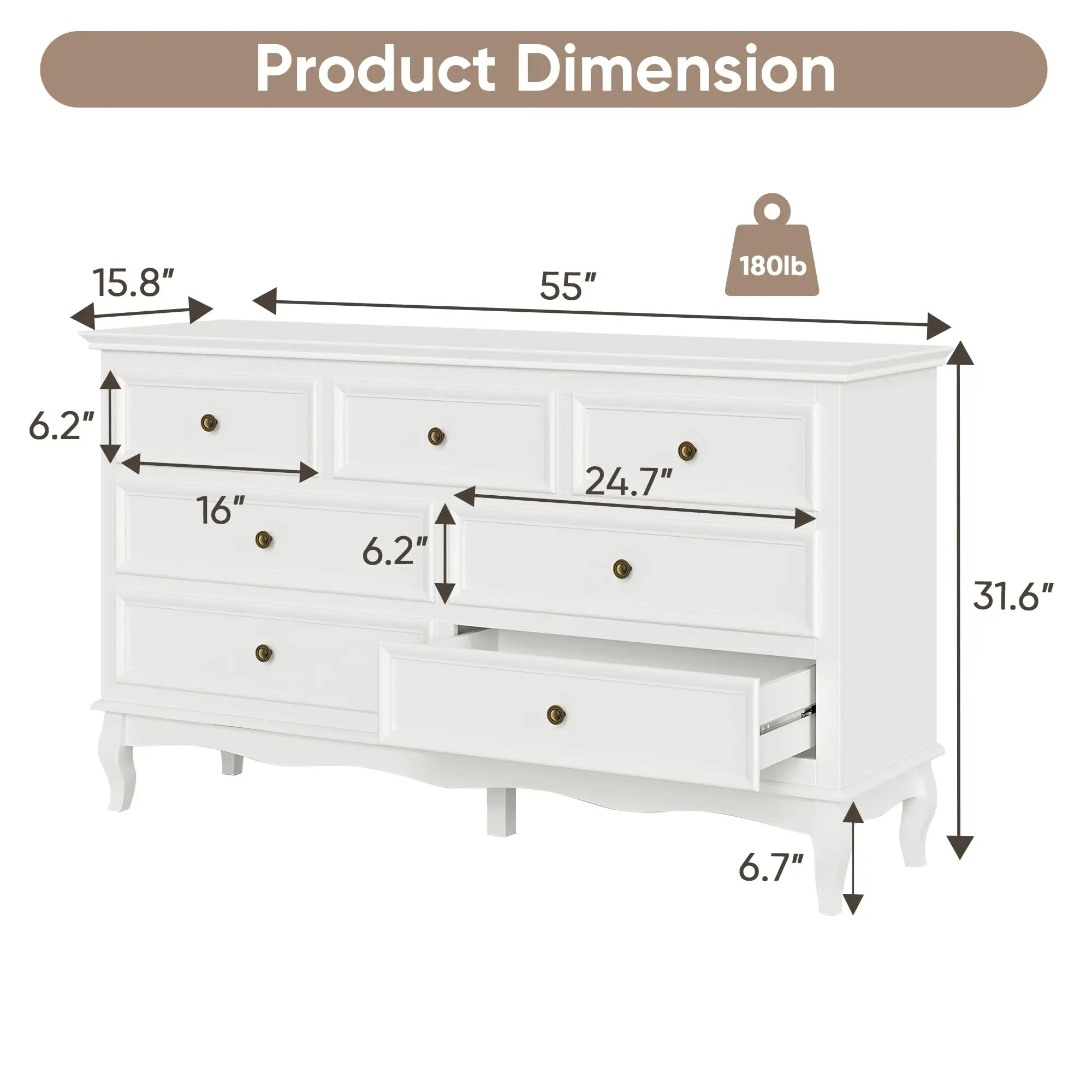 【Versatile Storage】55'' Long drawer dresser for bedroom use also serves as an ideal storage cabinet in your living room. It doubles as a TV stand and stores electronics, photos, and more, making it your go-to drawer storage solution.